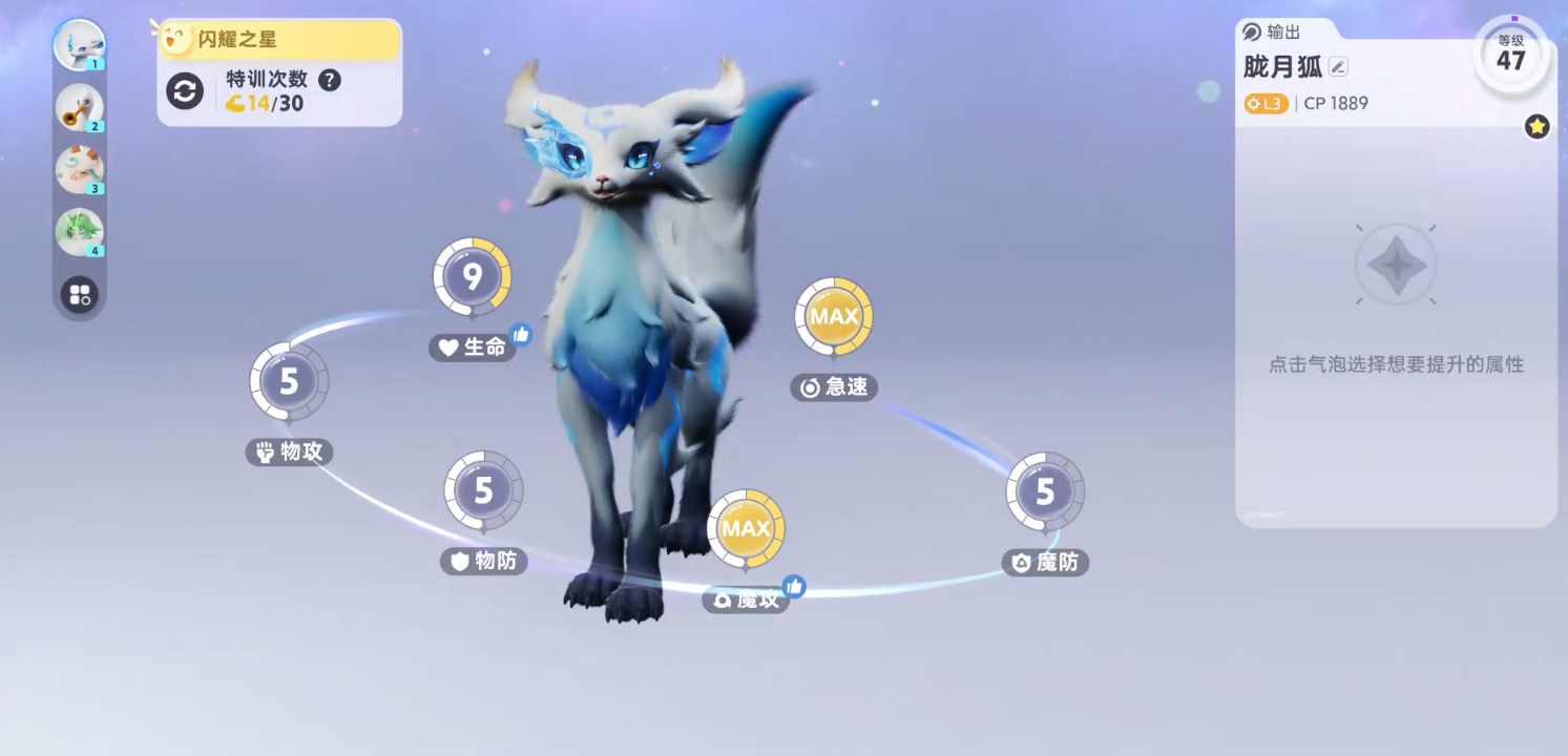 胧月狐是伊莫光伊莫中极具代表性的光系精灵。它基础属性突出,敏捷与魔法攻击尤为出色,技能设计兼顾单体爆发与群体压制。初始阶段,胧月狐就展现出强大实力,个体值五项全满,在平民阶段属性面板顶尖,是前期性价比极高的强力神宠。玩家开局即可免费领取,无需额外获取,大大降低了培养门槛。