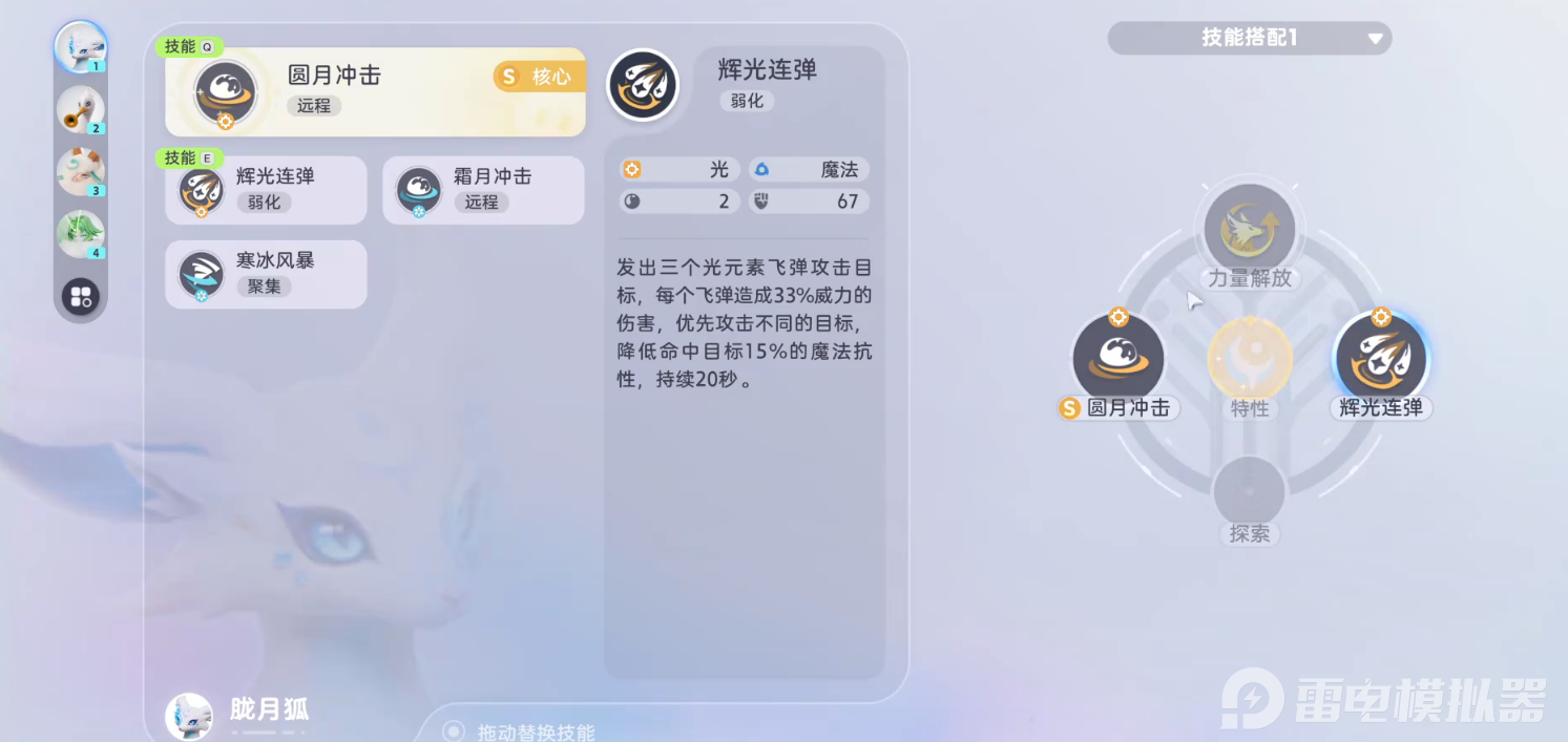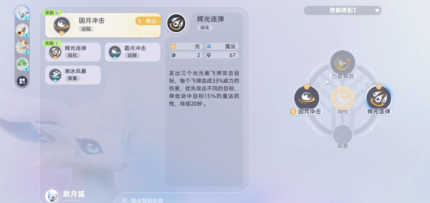 合理的阵容搭配能让胧月狐的实力得到充分发挥。常规组合中,胧月狐搭配小炭犬和莲顶鱼,形成输出、解谜、续航的三角体系。小炭犬的冲刺和跳跃能加速跑图,还能触发机关解谜;莲顶鱼的“治愈之水”能持续回血并套盾,为队伍提供续航保障。这种组合适合日常探索和普通副本,兼顾多种需求。