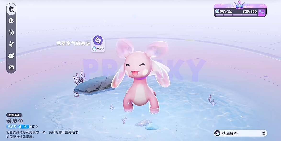 顽皮鱼为小鱼形伊莫,水下移动快速,可挖掘土层开辟捷径,探索效率高。进化为莹冰龙后增加冰属性控制与输出,并强化治疗效果。刷新地点在荷叶塘或溪流全天可捕捉,完成“顽皮鱼的成长”任务链可进化。