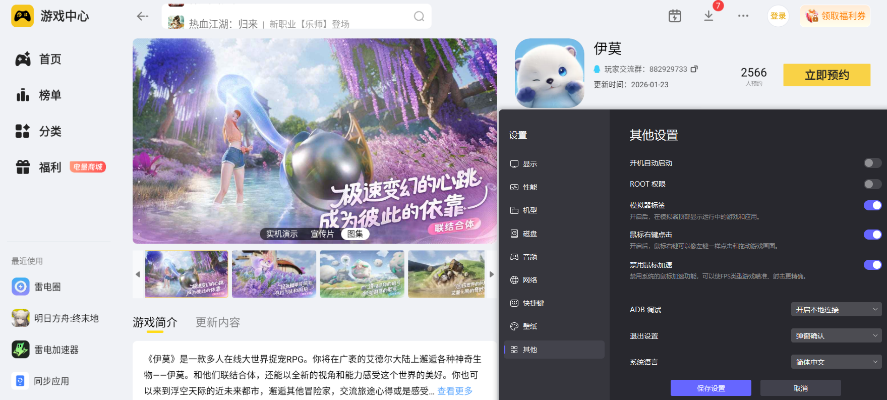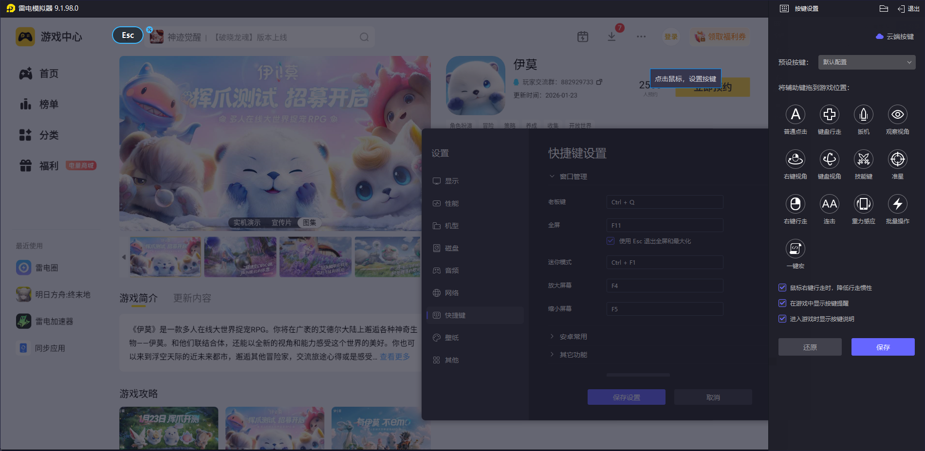 用雷电模拟器玩《伊莫》,支持自定义键鼠映射,可将移动、跳跃、宠物技能、交互等功能设置成快捷键。地宫探索中推电箱、精准跳跃平台时,鼠标控制方向更精准,键盘按键反应更快,不会出现手机触屏误触的情况,比如导电机关需要反复调整木箱位置,键鼠操作能一次到位,节省解谜时间。