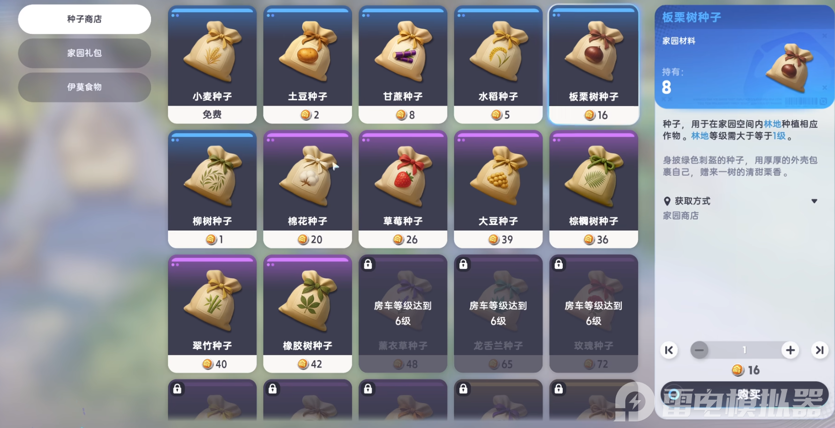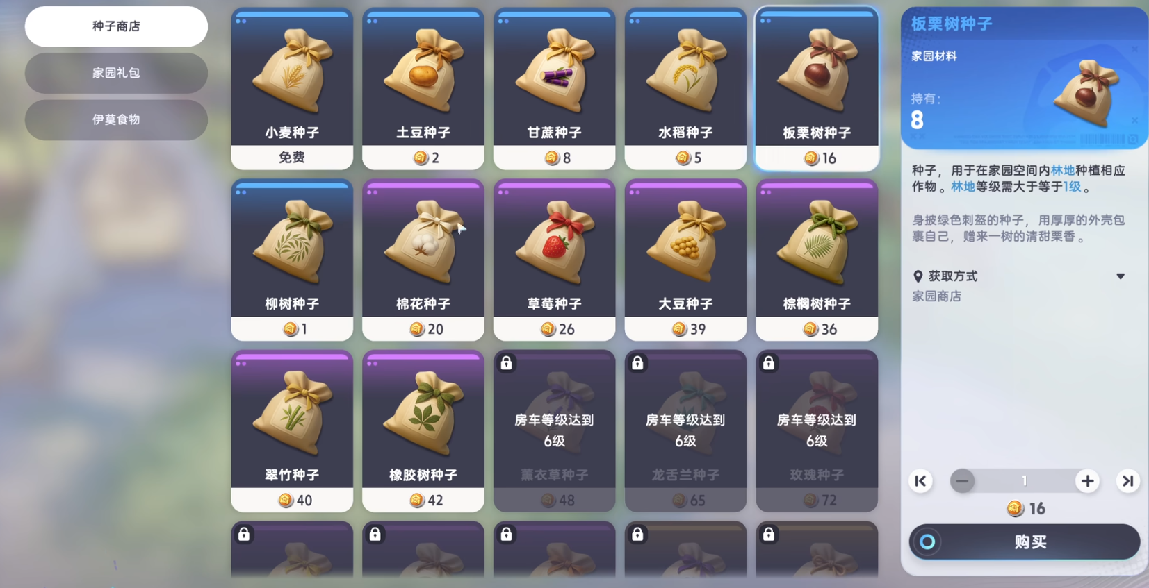 种植前要挑选肥沃的土地,不同土地属性不同,有的肥力充足,有的适合特定作物。种子可在家园商店兑换,新手前期建议选生长周期短的作物,快速积累经验解锁更多地块;中后期地块增多后,可换种收益更高的长周期作物,提升资源获取效率。