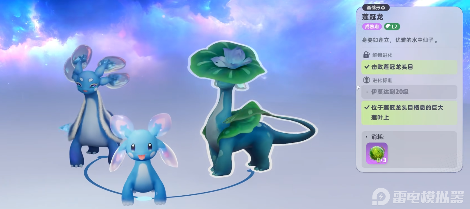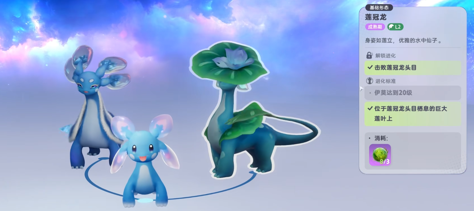 击败BOSS后不要着急离开,进化的关键在于“巨大叶片的托举”——这里的叶片就是BOSS战斗位置的荷叶。BOSS死后只有一分钟左右的时间窗口,需要快速切换出顽皮鱼站在叶片上,就能直接完成进化,成功解锁伊莫莲冠龙。