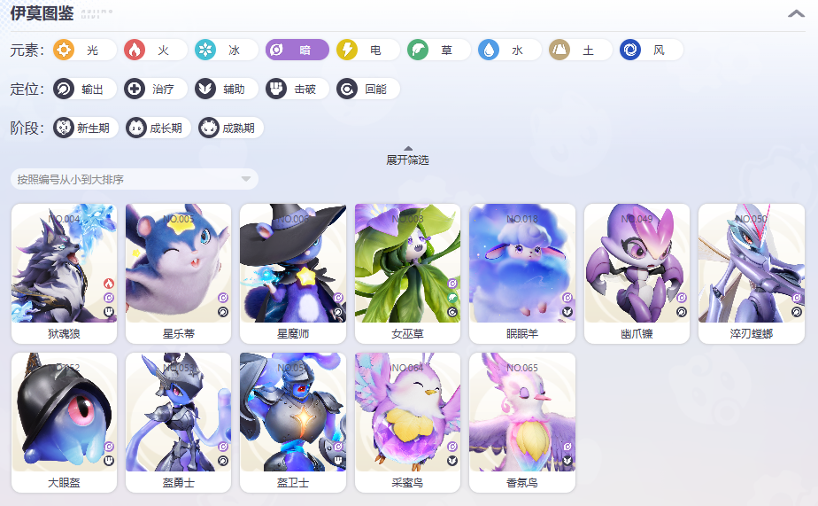 成员:狱魂狼、星乐蒂、星魔师、女巫草、眠眠羊、幽爪镰、淬刃螳螂、大眼盔、盔勇士、盔卫士、采蜜鸟、香氛鸟等。星魔师是远程核心。暗系压制草与火系;但被光与电系双重克制,实战需避开锋芒。