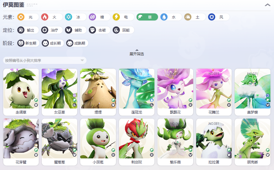成员:走调草、女巫草、埋埋、莲冠龙、飘飘花、花舞兰、美梦蝶、花芽蟹、蟹葱葱、小哭苞、刺剑玫、魅乐薇、拉拉蛋、朋克蜥等。刺剑玫是输出核心。草系克制水与土系,能打断治疗;但被火与暗系克制。