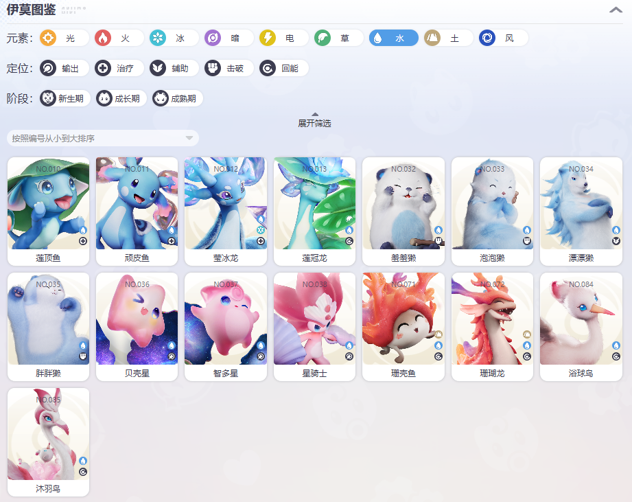 成员:莲顶鱼、顽皮鱼、莹冰龙、莲冠龙、羞羞獭、泡泡獭、漂漂獭、胖胖獭、贝壳星、智多星、星骑士、珊壳鱼、珊瑚龙、浴球鸟、沐羽鸟等。水系克制火与金属性,提供续航保障;但被草与电系反制,会被吸收治疗或遭受压制。