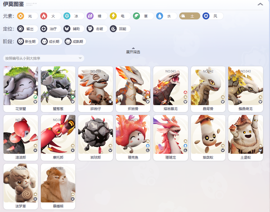 成员:花芽蟹、蟹葱葱、碎岩仔、炽岩兽、熔岩暴龙、晶背兽、簇晶脊龙、滚滚郎、摩托郎、岩球郎、珊壳鱼、珊瑚龙、烟囱蚁、土堡蚁、迷梦崽、暴睡熊等。土系克制金与水系,坦度极高;但被草与水系克制。