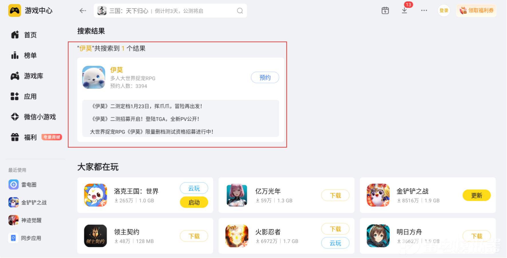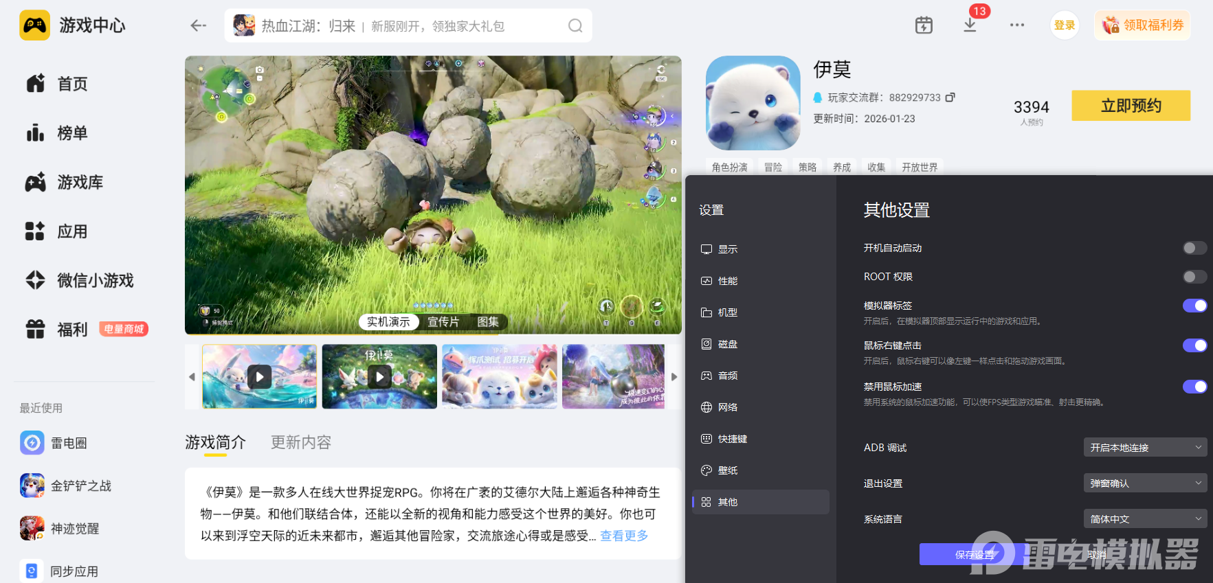 大家如果想获得更优质的游戏体验,可以使用雷电模拟器在电脑上游玩伊莫。电脑端的运行模式能更好适配游戏的宠物战斗、地图探索等核心玩法,突破移动端的游玩局限,让新手在宠物培养、战斗操作、地图探索的全过程中,拥有更顺畅、更沉浸的游戏感受,轻松解锁游戏的全部核心乐趣。