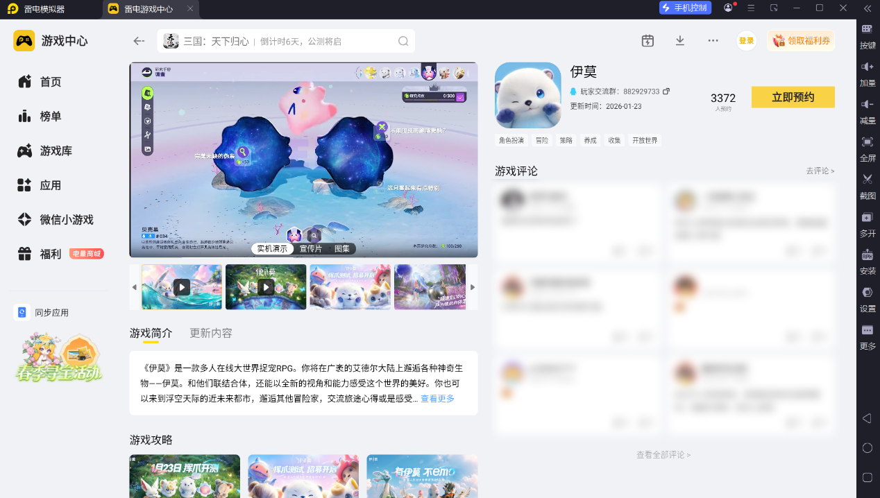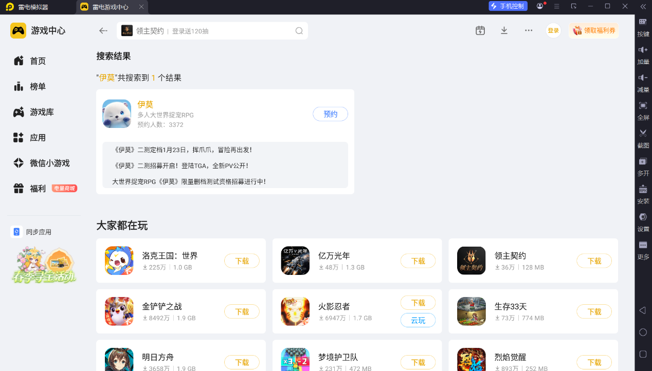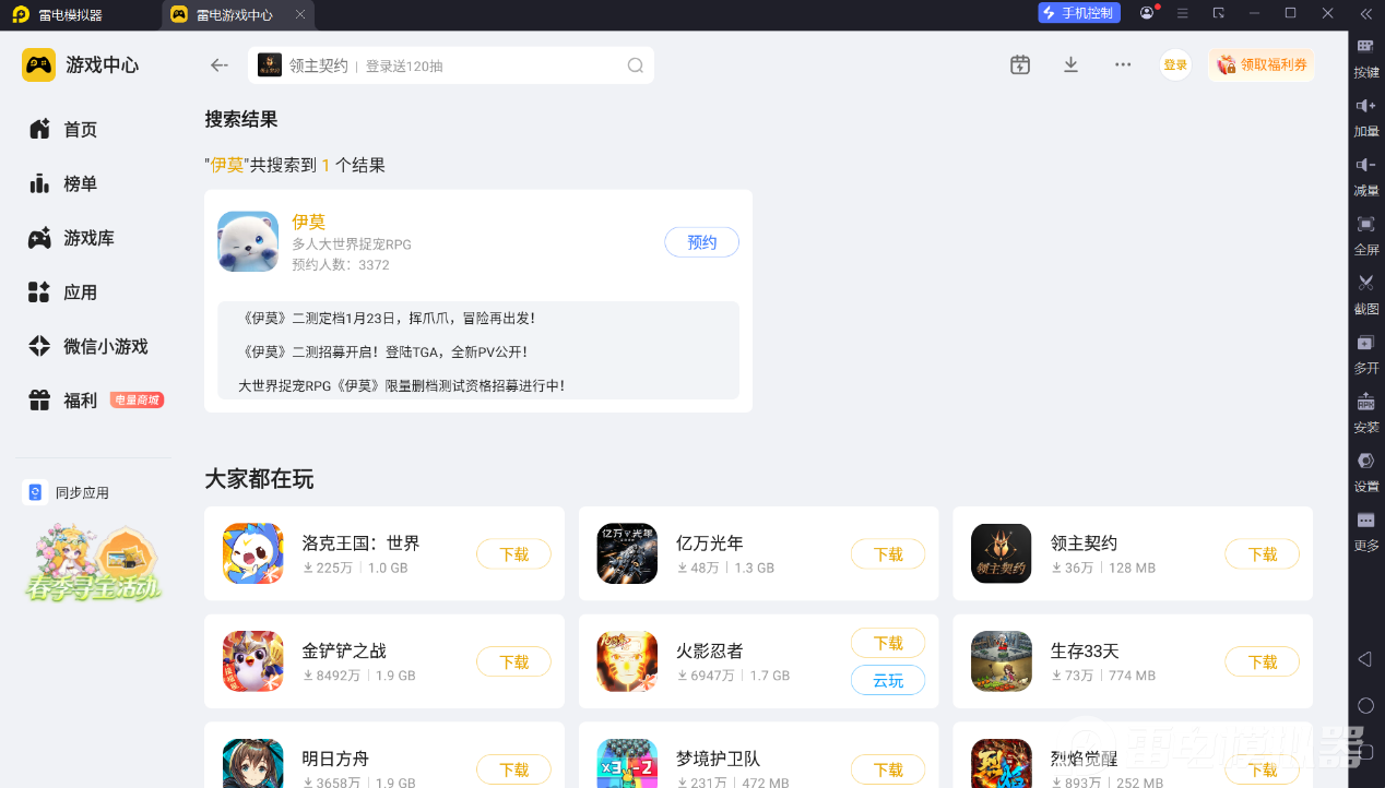 想要体验伊莫的玩家,可前往雷电模拟器内的游戏中心,完成游戏的预约与下载操作。具体步骤是,先在浏览器中搜索雷电模拟器官网,下载并安装最新版本软件,启动模拟器后进入内置的雷电游戏中心,在搜索栏输入 “伊莫”,找到对应游戏后点击预约按钮,待游戏正式上线就能第一时间获取下载资格,全程操作简单且安全稳定。
