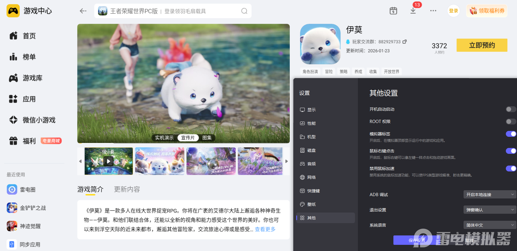 当然,大家也可以使用雷电模拟器在电脑上玩伊莫,能够全方位提升游戏的整体体验,不管是场景探索还是宠物战斗捕捉,都能摆脱手机设备的游玩局限,让玩家在体验霜锋狼任务等核心玩法时,拥有更舒适、更沉浸的游玩感受,轻松畅享游戏的全部玩法乐趣。
