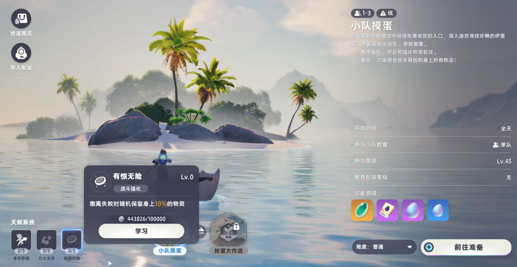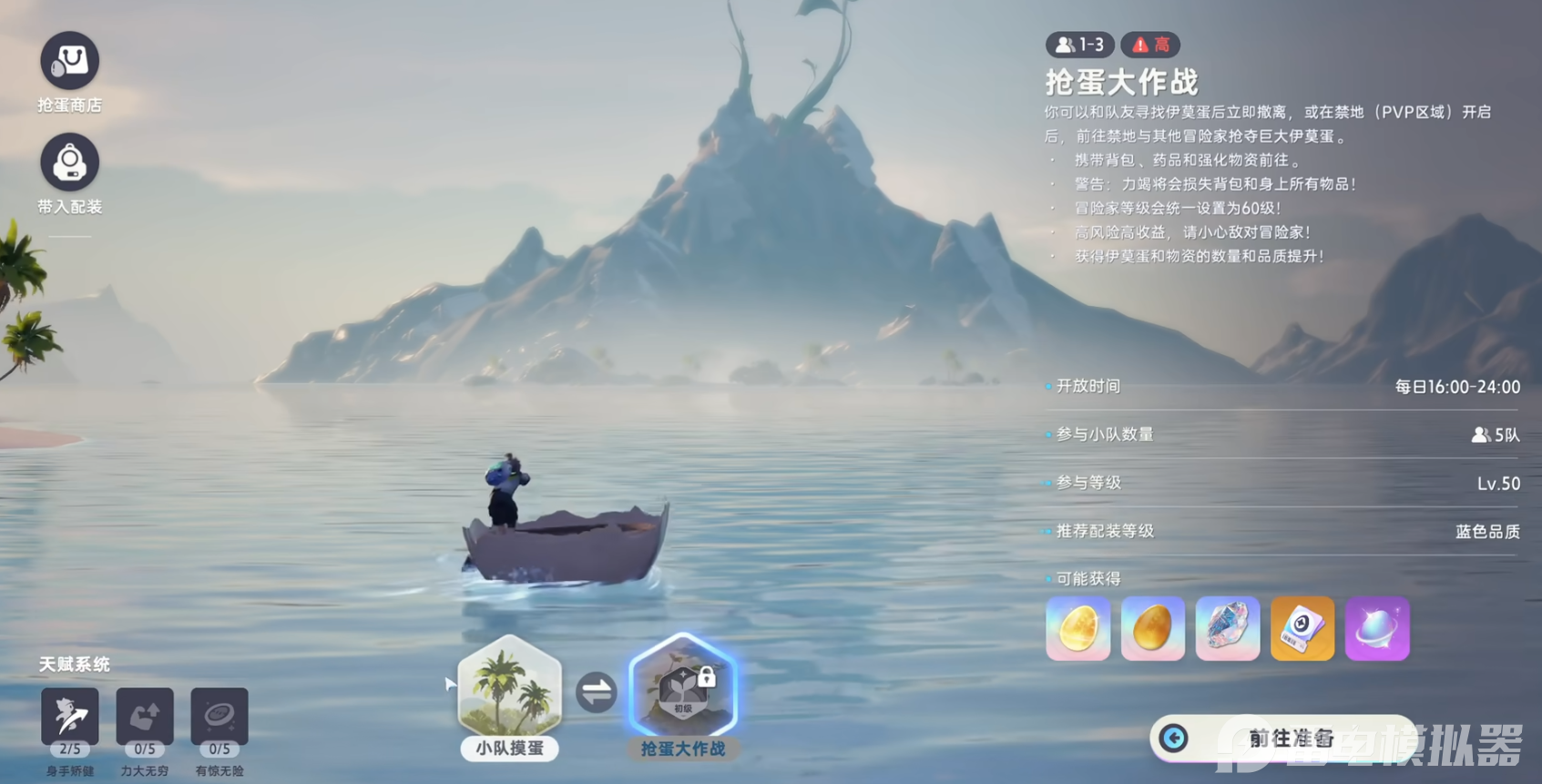 抢蛋大作战是伊莫打造的专属PVPVE玩法,所有对局都会在失落群岛专属地图中展开。该玩法以三人小队为基本参与单位,整张地图划分为外围探索区和核心对抗区两个部分。外围区域分布着古代遗迹、隐秘洞穴和各类补给点,玩家需要先完成物资采集和线索收集,解锁核心区域后,就能前往场景中央争夺稀有伊莫蛋,触碰蛋体后会进入蛋形态,成功返回初始蛋船完成撤离,即可顺利夺蛋。