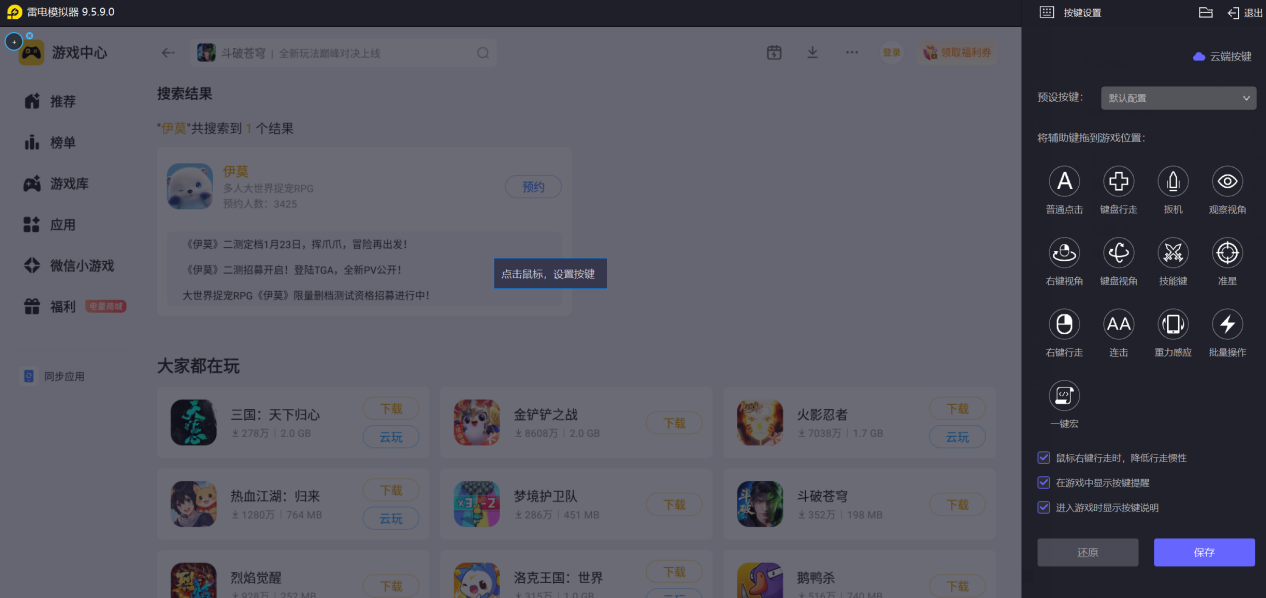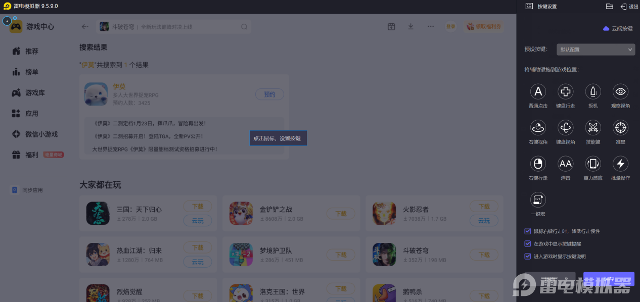 雷电模拟器还支持键鼠操作,可以自定义快捷键与一键连招。鼠标精准控制视角与技能释放,键盘快捷键可快速触发传送、切换昼夜、释放技能,无论是跨区域传送刷闪、昼夜切换重roll,操作都更精准、更高效。