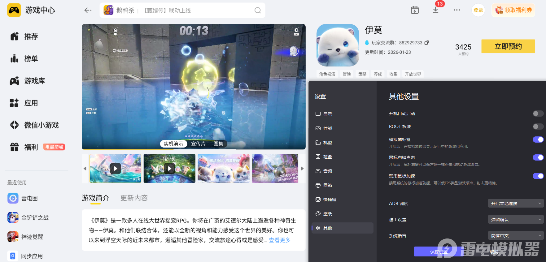 大家如果想要获得更优质的游玩体验,那就使用雷电模拟器在电脑上游玩这款游戏,能让整体的游玩感受变得更加舒适,摆脱手机游玩的各类局限,更全身心地投入到游戏的冒险与养成之中。