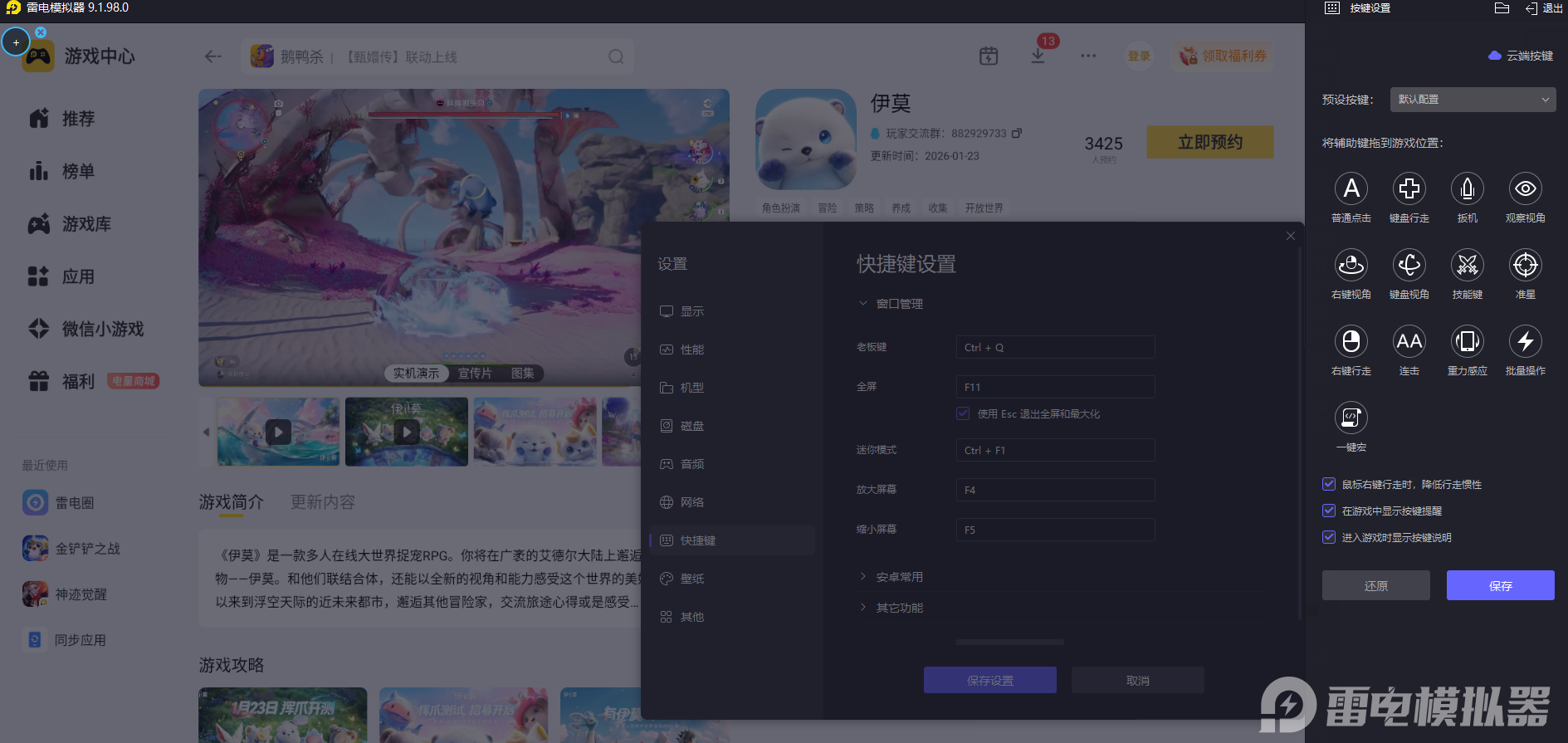 完成伊莫每日必做任务时,需要频繁进行点击、选择、战斗等重复操作,长时间手机触屏操作会让操作效率变低,任务完成速度也会变慢。雷电模拟器支持键盘鼠标自定义按键映射,能把游戏各类操作绑定到键盘按键上,精准快捷的按键操作,能大幅提升任务完成效率,繁琐的日常操作也会变得轻松顺手。