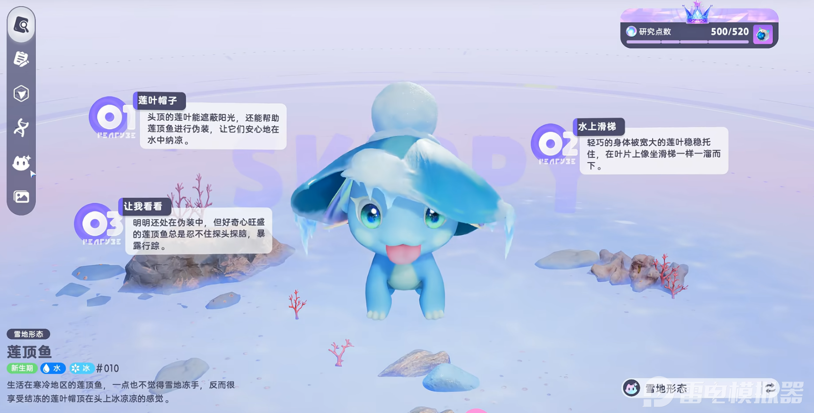 莲顶鱼是阵容专属的治疗辅助宠物,主打团队续航。它的主动技能可以为全队宠物恢复血量,缓解前期战斗中的血量损耗问题,让队伍不用频繁补给就能持续作战。被动技能能小幅提升自身治疗效果,即便面对强度较高的怪物,也能稳住全队血线,保障阵容的生存能力。