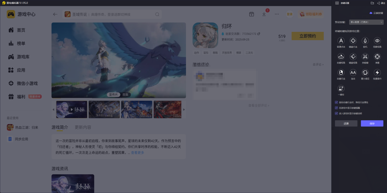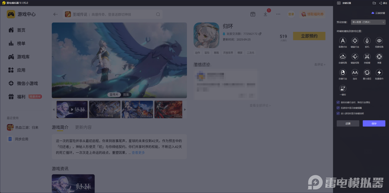 针对归环的复杂操作,雷电模拟器提供完善的键鼠映射功能。WASD 键可灵活控制角色移动与菜单切换,比触屏滑动更精准,避免探索时误触场景;大招与关键技能可绑定键盘快捷键,鼠标点击即可锁定目标释放,BOSS 残血时能精准衔接必杀技,提升通关效率。