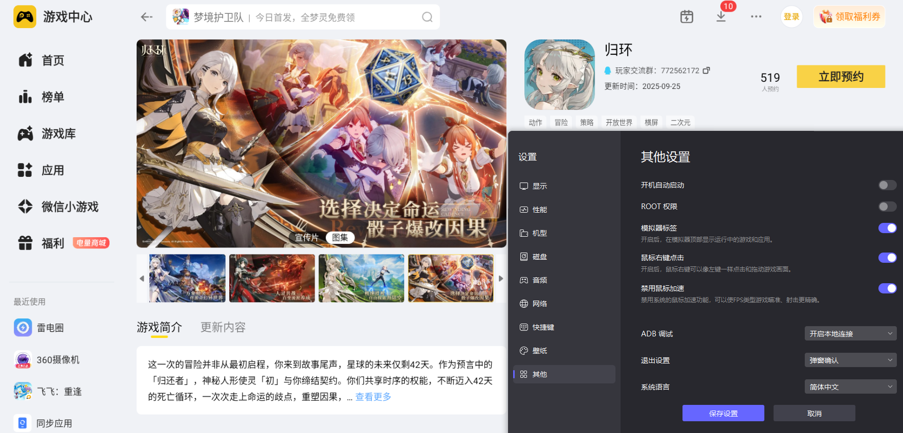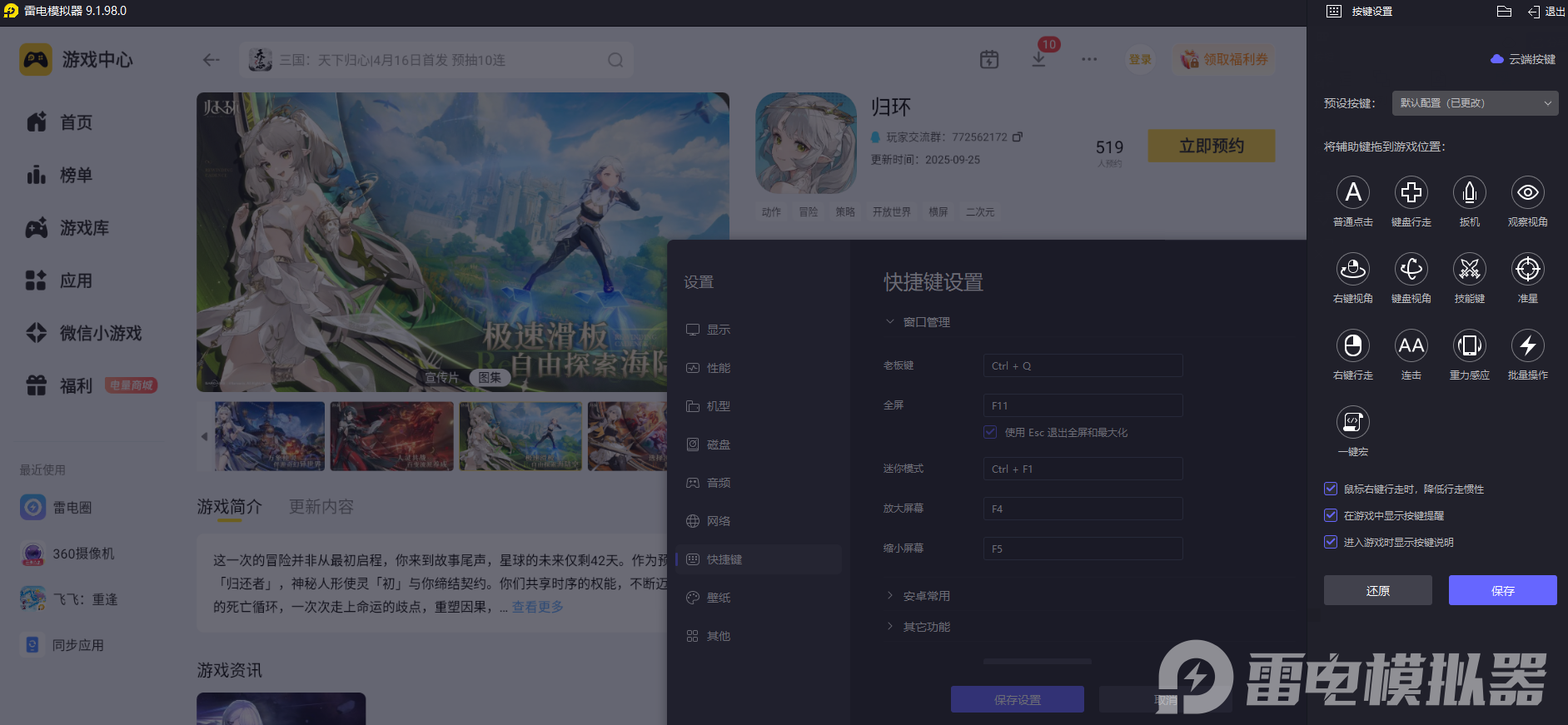 归环包含时间回溯、滑空匣操控、角色技能连招等内容,操作环节多且需要精准触发,常规操作模式难以适配复杂的操作节奏。雷电模拟器支持键鼠自定义设置,可根据游戏操作逻辑绑定按键,让技能释放、道具切换、场景互动更精准,适配各类操作需求,提升操作流畅度。