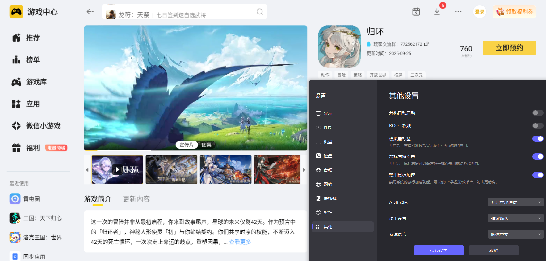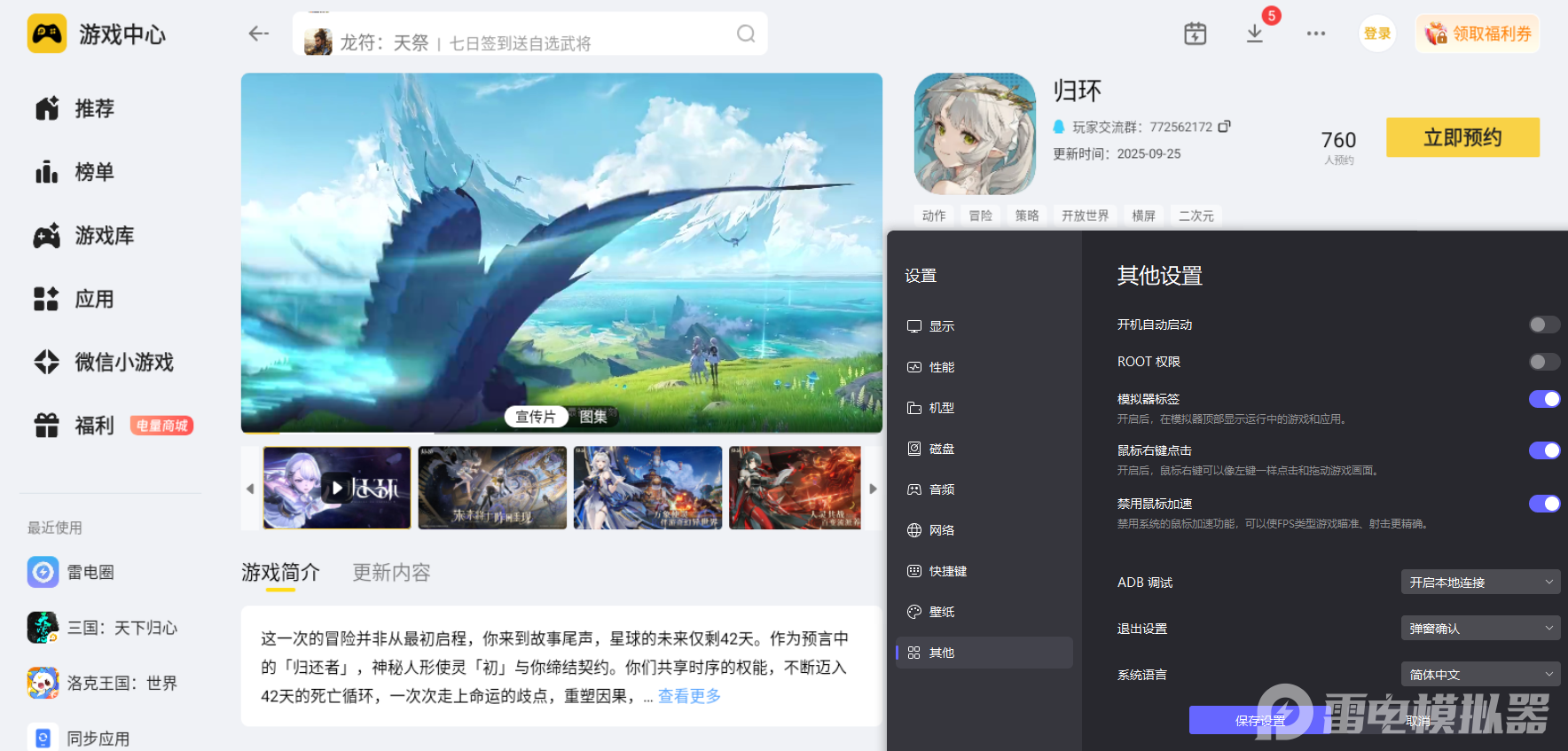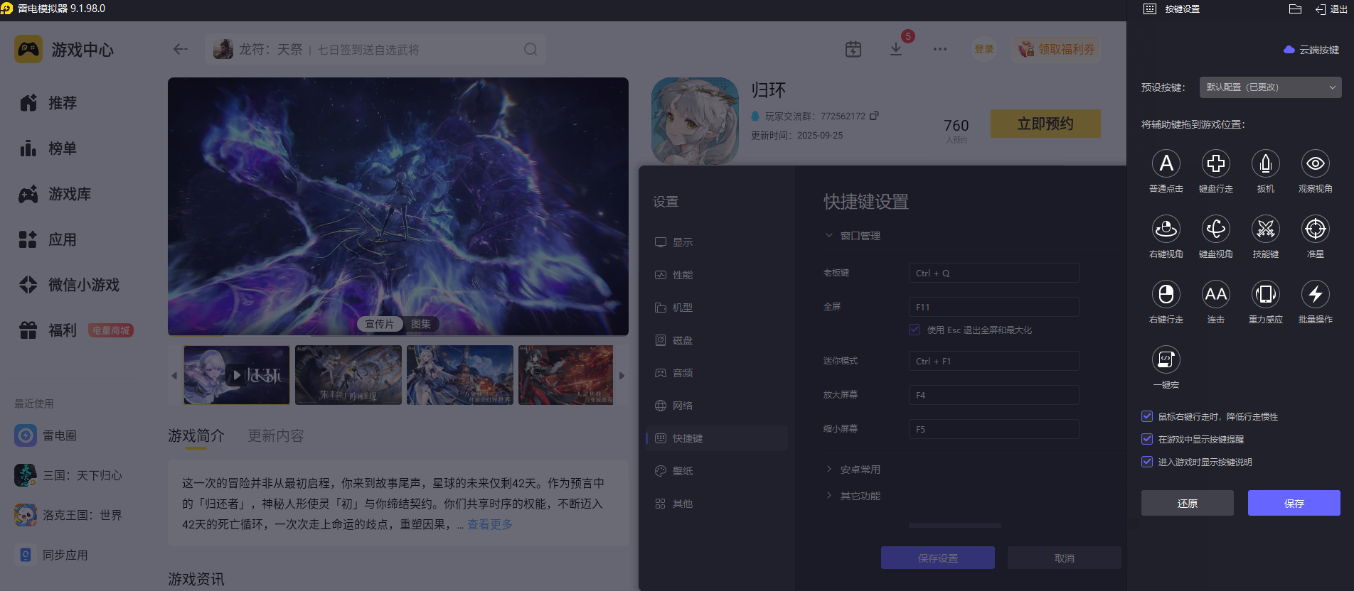 其实,大家可以用雷电模拟器在电脑上玩归环,手机屏幕尺寸有限,长时间握持容易疲劳,操作精度也会受影响,而电脑的大屏幕和键鼠操作能带来更沉浸的游戏体验。