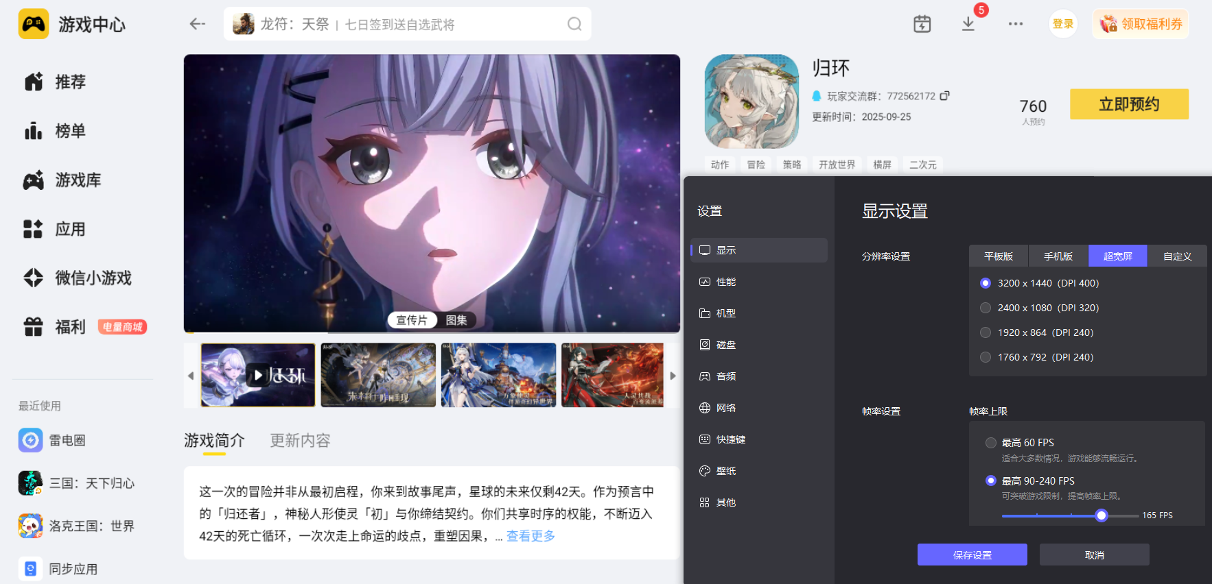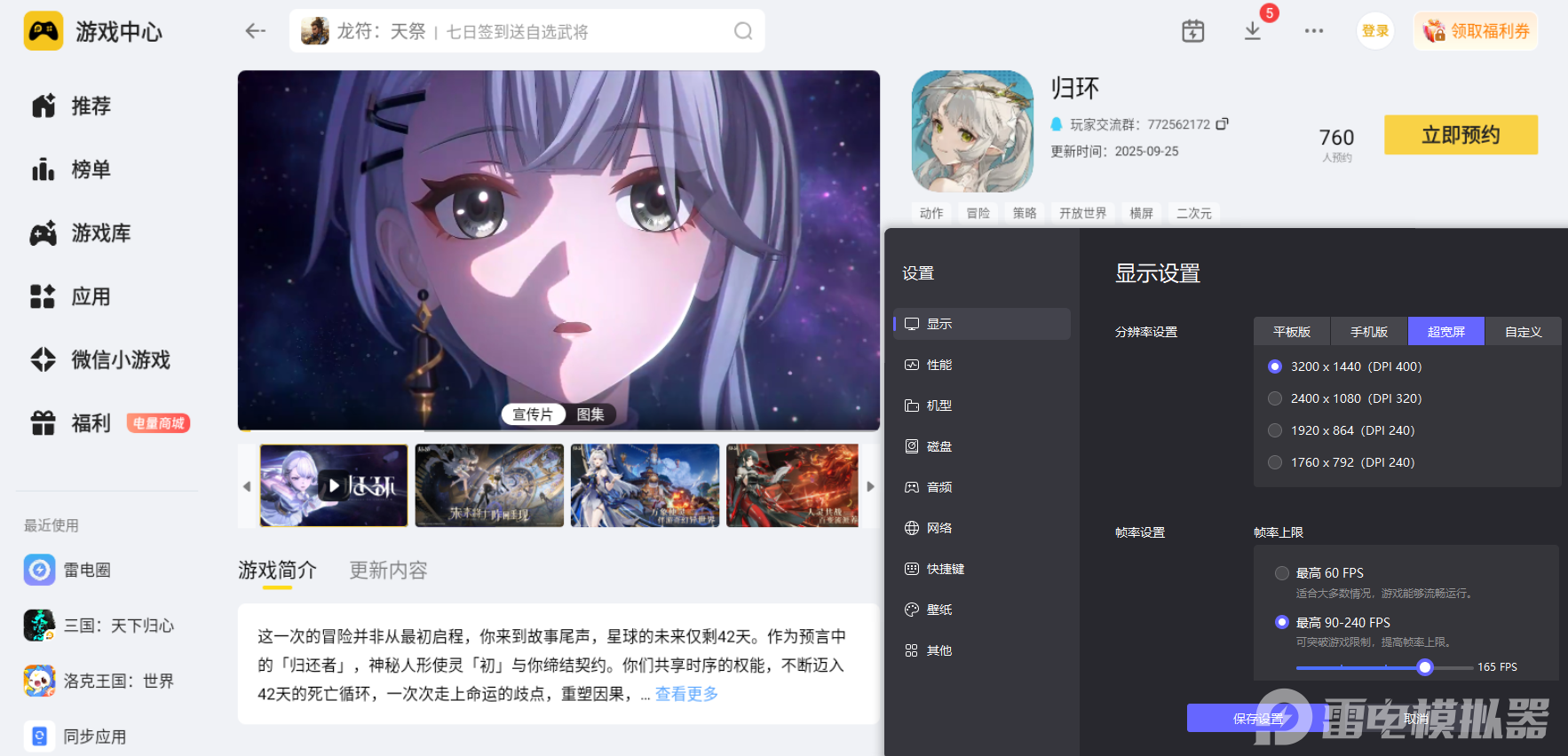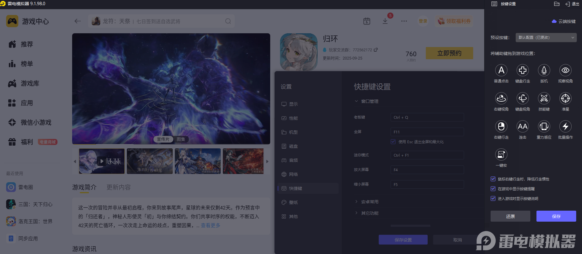 其实,大家可以用雷电模拟器在电脑上玩归环,手机屏幕尺寸有限,长时间握持容易疲劳,操作精度也会受影响,而电脑的大屏幕和键鼠操作能带来更沉浸的游戏体验。