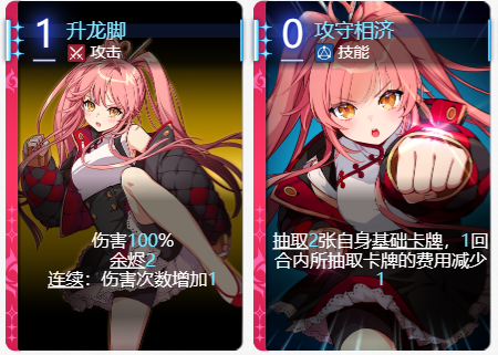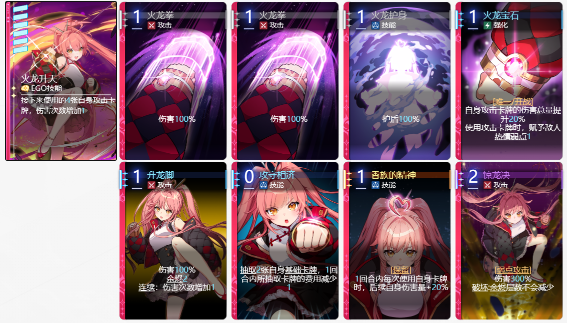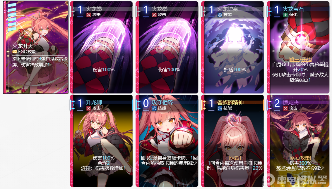 梅铃的卡组构建需围绕“叠层-爆发”循环展开。推荐组合为:2张一费攻击卡(如升龙脚)、1张攻防一体、1张火龙宝石、2张热情状态卡。前期利用低费攻击卡与攻防一体快速抽牌减费,中期通过热情卡施加弱点并削减敌人韧性,后期配合火龙宝石触发双重强化,实现“一回合秒杀”效果。