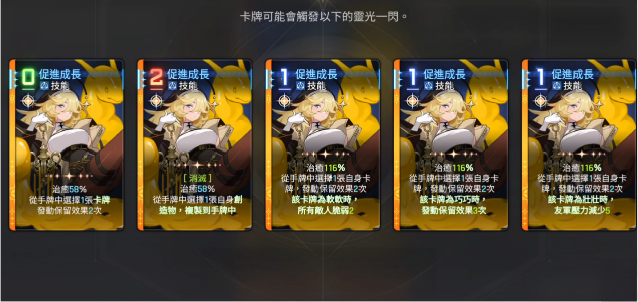 修女的1费技能促进成长非常实用,既能提升治疗效果,还能让创造物触发两次保留效果,大幅强化收益。她的被动效果在手牌有创造物时,会提升全队伤害,使用创造物还能对敌人造成额外伤害,让辅助能力与输出能力完美结合。