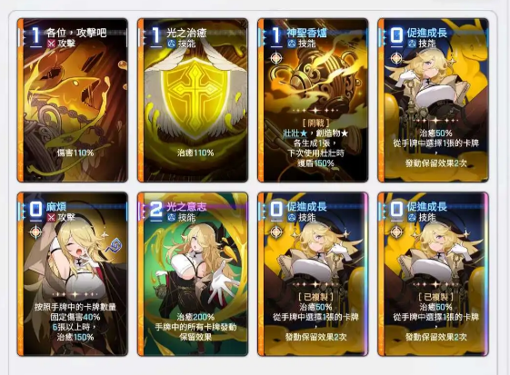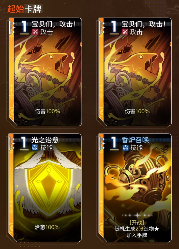 奥莱娅起始卡牌包含“宝贝们,攻击!”、“光之治愈”和“香炉召唤”等基础技能,能对敌人造成伤害,也能提供治疗和生成造物卡牌。玩家可以在实战中通过灵光一闪系列卡牌,例如“促进成长”、“香炉召唤”、“麻烦不断”和“进化”,快速累积手牌优势,提升整体战力。“光之意志”技能则能发动手牌中所有保留效果,形成高效的群体治疗或增益,极大提高战局可控性和队伍续航能力。