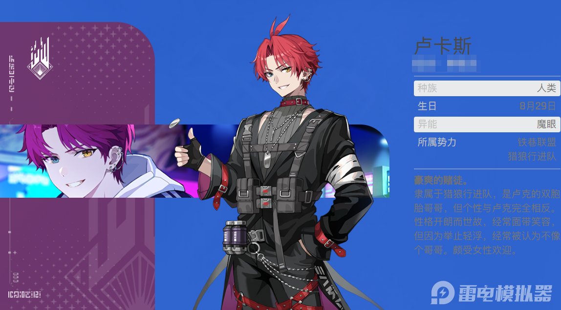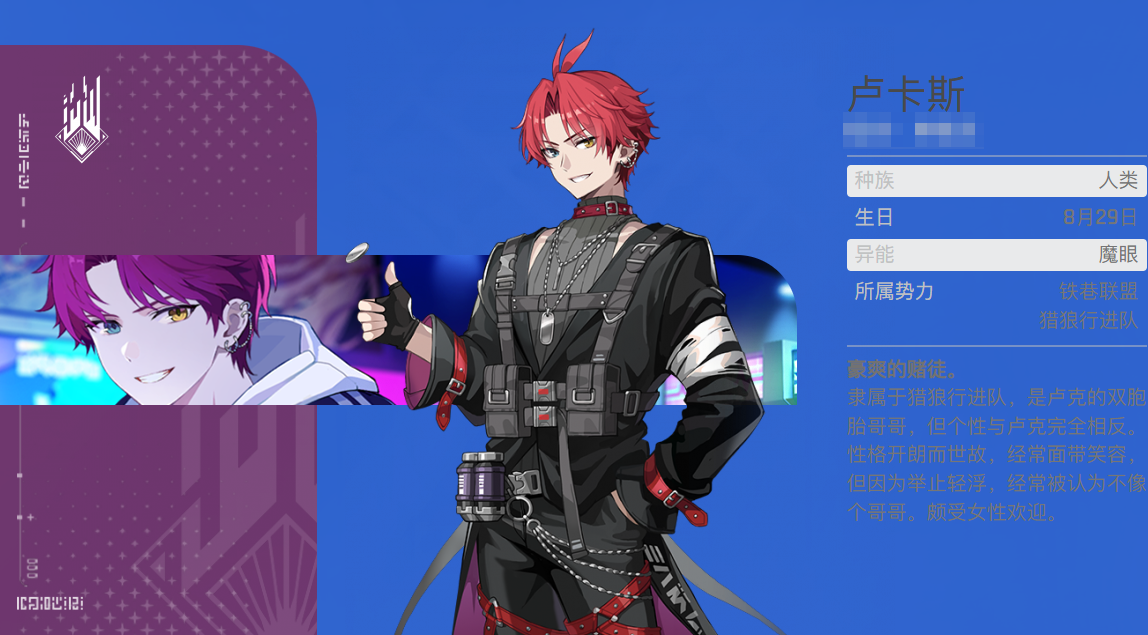 卡厄思梦境卢卡斯是铁巷联盟中的"豪爽赌徒",身为卢克的双胞胎哥哥,性格却与弟弟完全相反——愉快而世故,经常面带笑容,举止轻浮却意外受女性欢迎。他拥有"魔眼"异能,职业定位为猎人,属性为热情。作为四星角色,卢卡斯虽基础属性略逊于五星战员,但凭借独特的"发射器弹药系统"在实战中展现出极强的战术价值。