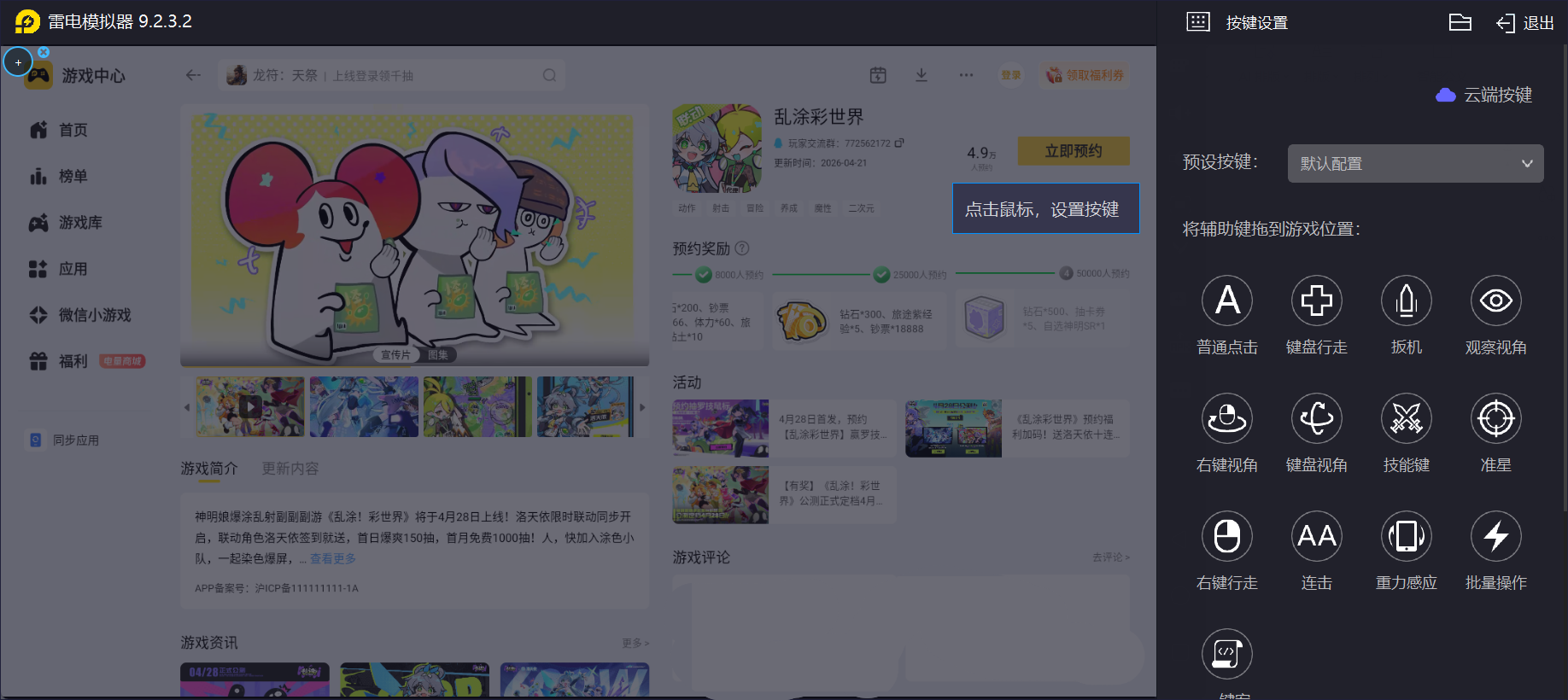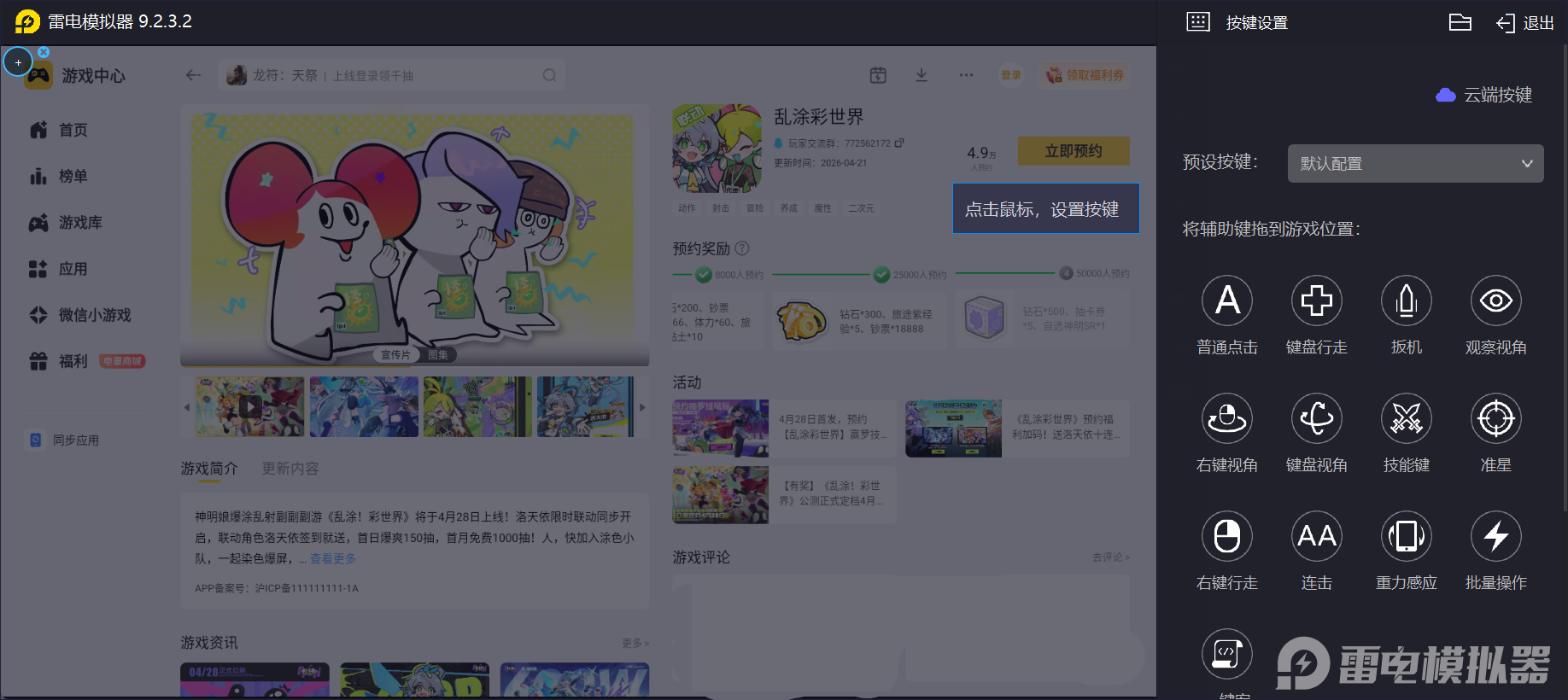 乱涂彩世界的染色效果和技能范围变化非常频繁,因此很多玩家在体验游戏时,会选择使用雷电模拟器在电脑端游玩,操作和观察都会更加清晰。