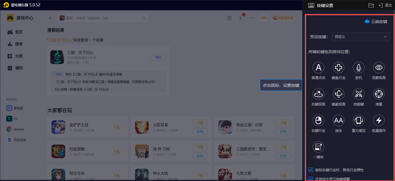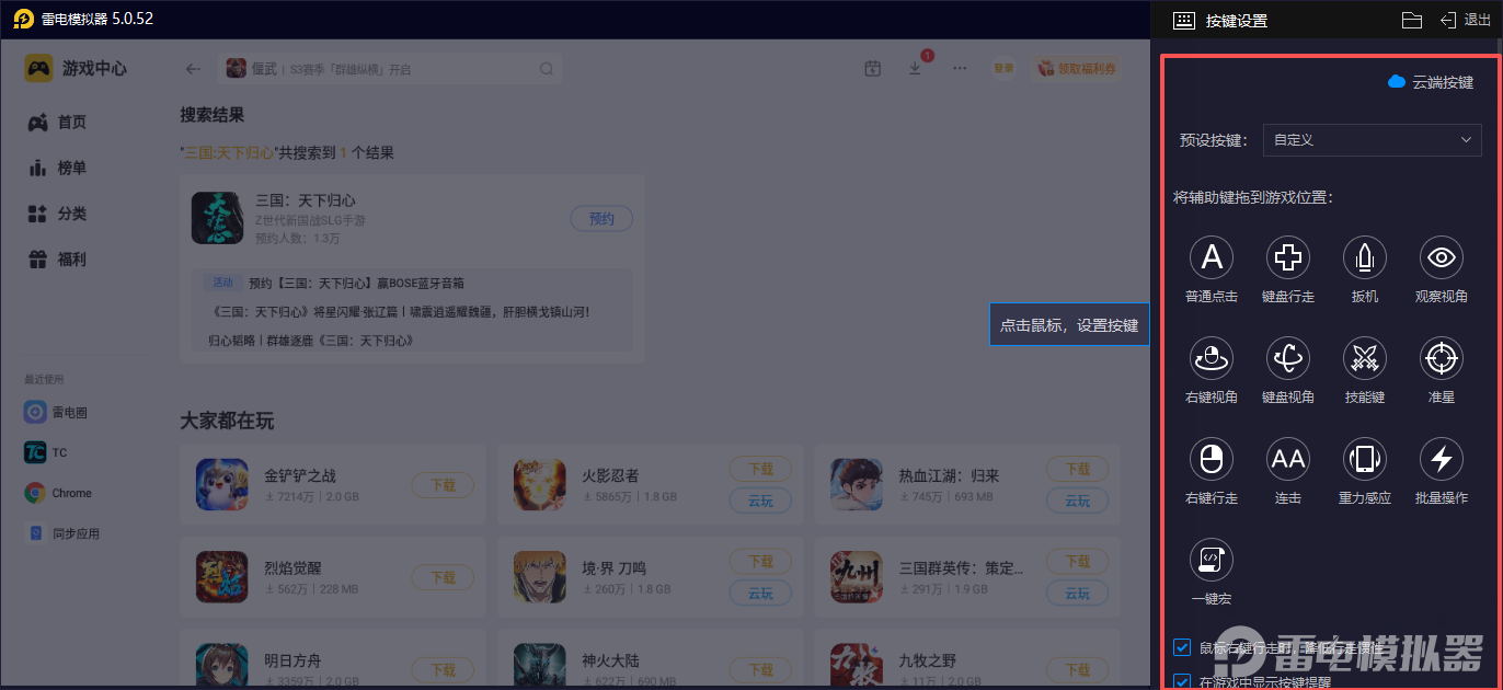 值得一提的是,为了能进一步优化玩家的操作体验快感,雷电模拟器内置的SLG专属键位预设,能让小伙伴们去自定义键盘快捷键,比如主动去设置“qwer”控制部队的技能释放,或者是直接上下左右来进行移动等都是可以的,相比手机触屏操作,键鼠响应速度更快,可实现九宫格布阵的快速调整、追击目标切换也能更加的迅速。