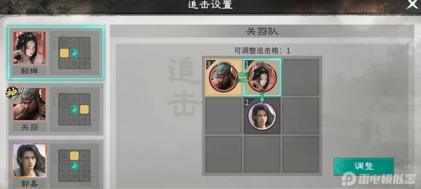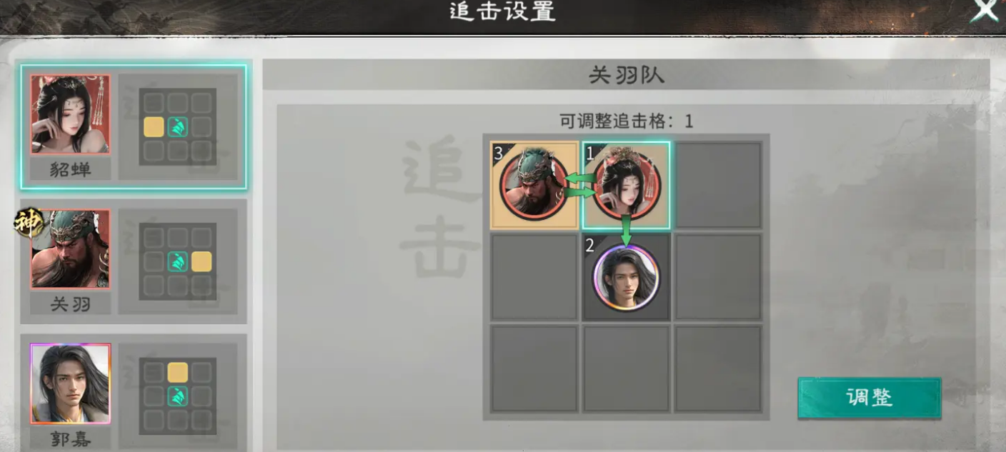 这里玩家可以把关羽放在刘备和张飞的追击格上,以最大化其输出能力;刘备的另一侧可搭配术士或弓兵补充自身的伤害效果。
