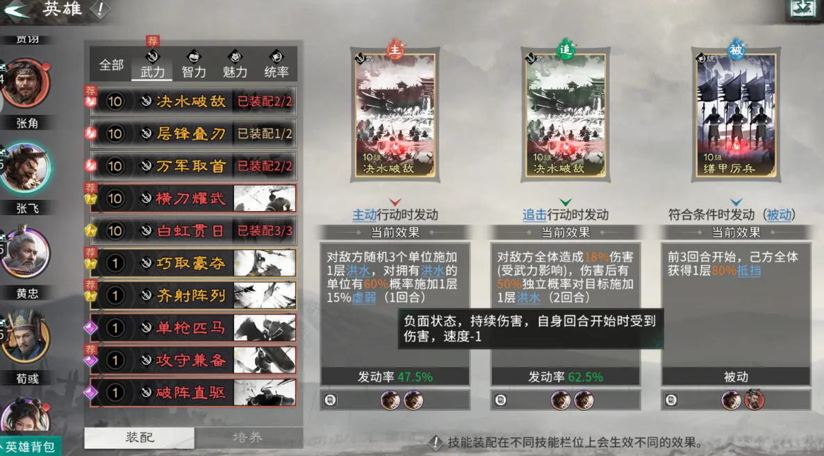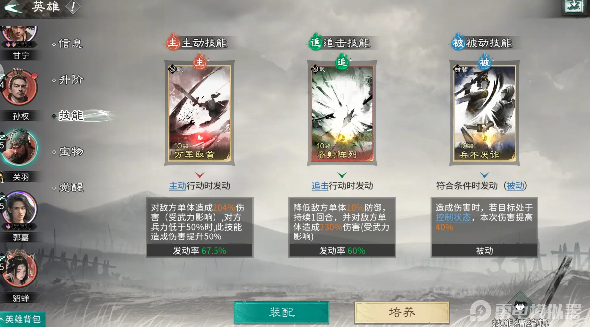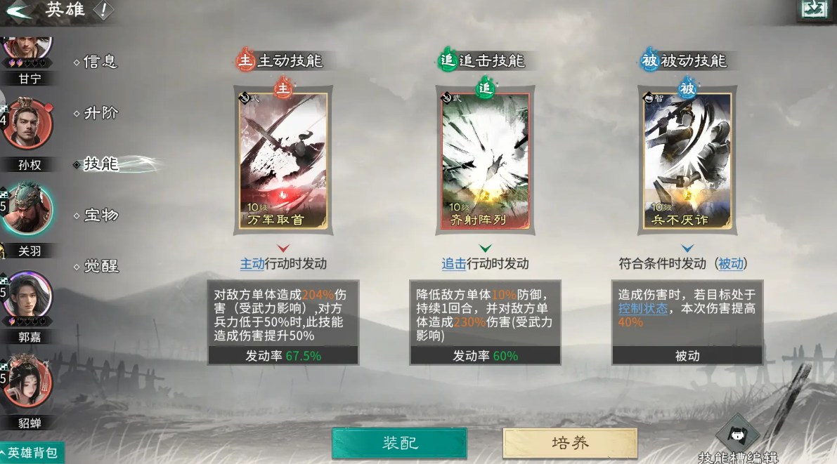技能方面,建议关羽可以装配白虹贯日、层峰叠刃等单体高伤的技能;刘备则是去选择和衷共济、通权达变等提升生存的技能;张飞携带猛将之魂等防御型技能即可。