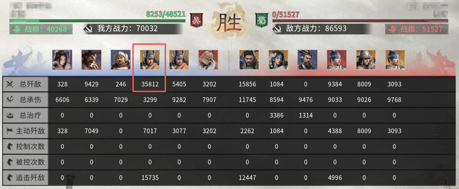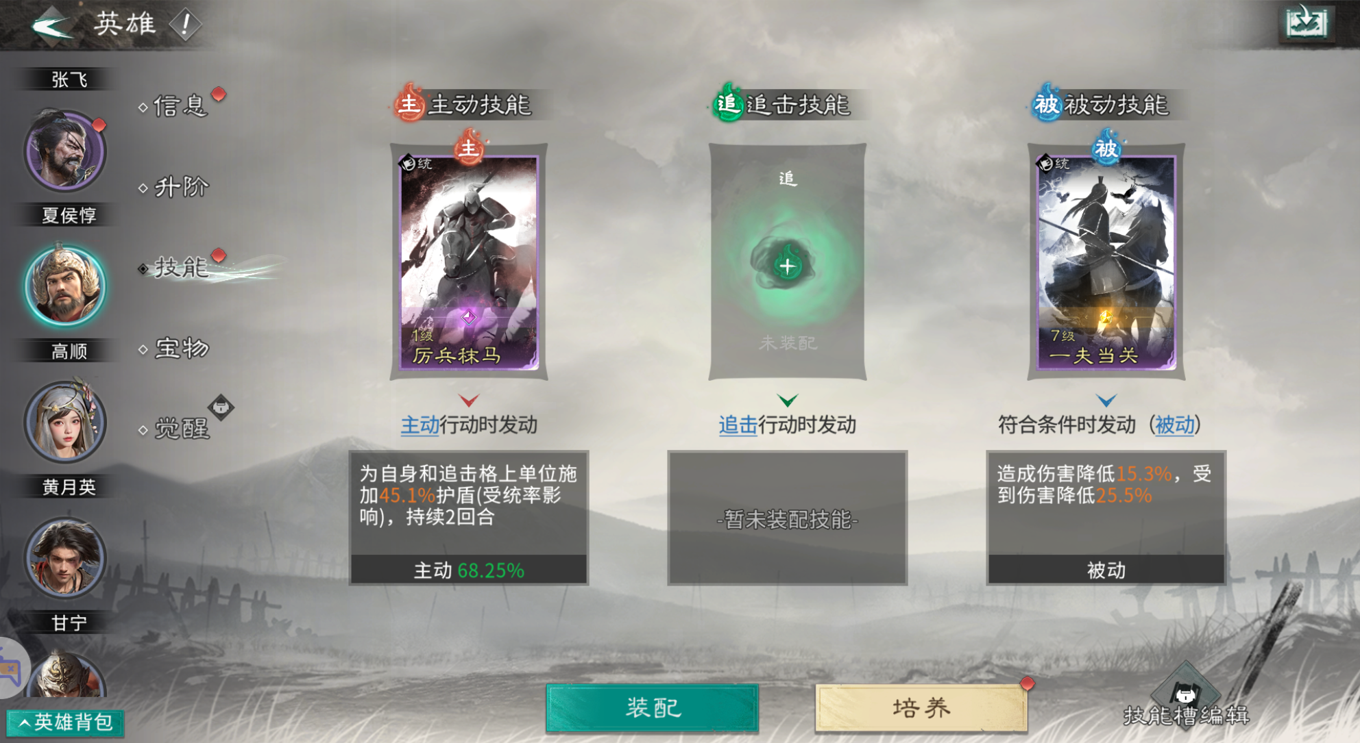 高顺主动技能携带【厉兵秣马】,被动技能携带【一夫当关】。