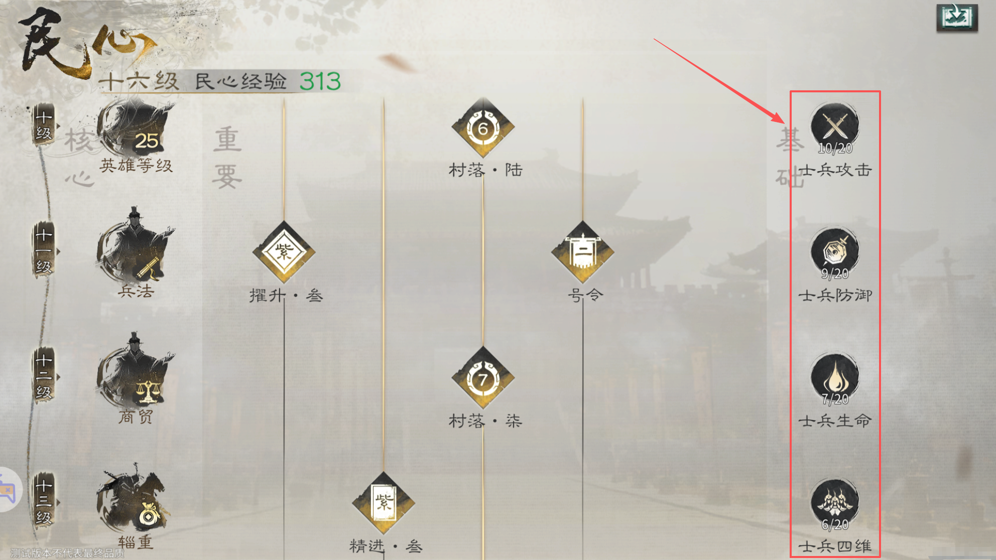 还需要注意的是,需要把民心10到13级中士兵的属性加成点满,民心不够可以优先提升满士兵攻击,再提升士兵四维,最后提升士兵防御和士兵生命。