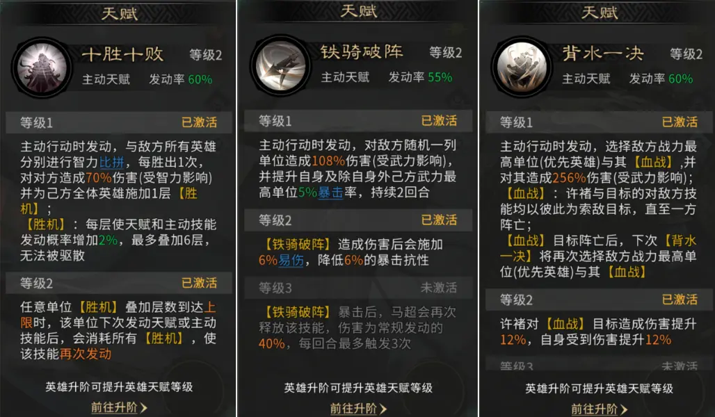 郭嘉施展天赋【十胜十败】,为己方叠加【胜机】层数,每层提高2%天赋与主动技能发动率,最高6层。叠满后,可使目标武将再次发动天赋或主动技能。
