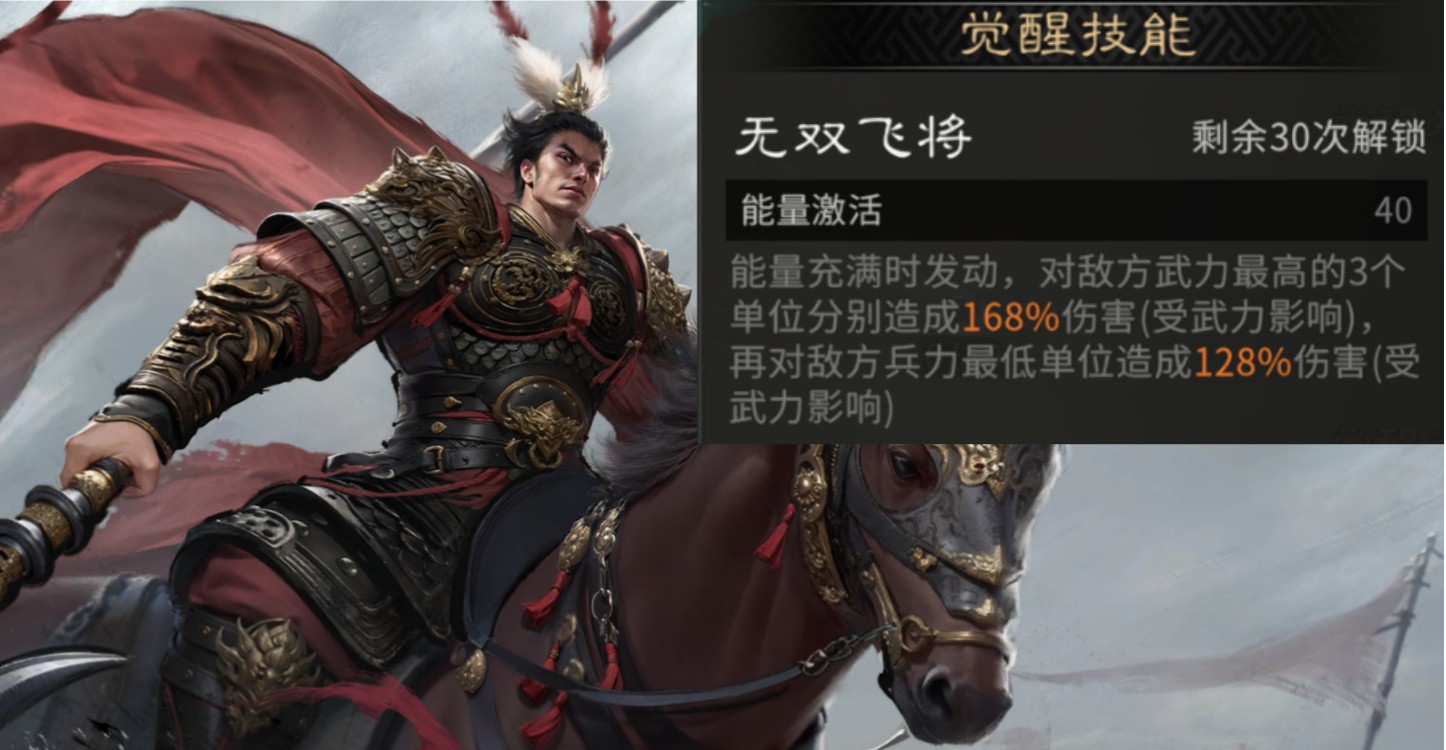 觉醒技能【无双飞将】:充满40能量时发动,对敌方武力最高的3个单位分别造成168%伤害,再对敌方兵力最低单位造成128%伤害。