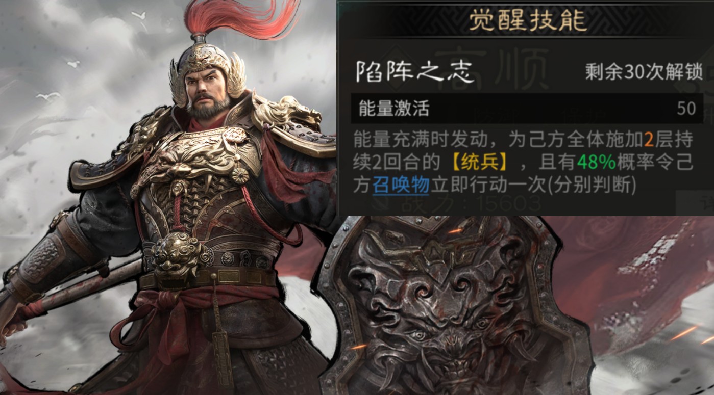 高顺的觉醒技能是召唤阵容的核心技能,有48%概率让召唤物立即行动一次,可以提高召唤阵容的上限。