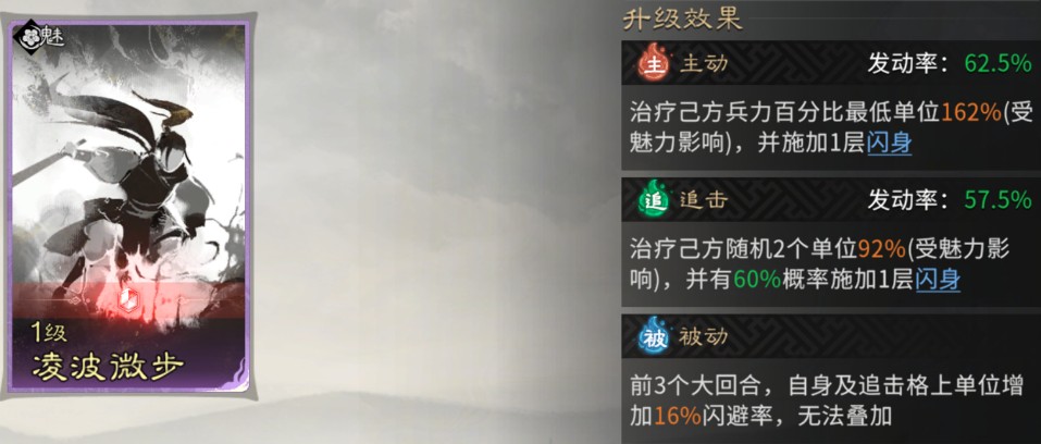 黄月英:主动技能固定携带【凌波微步】,为我方兵力百分比最低单位提供回复并施加一层闪身(必定闪避1次直接伤害,每触发1次减少1层)。追击技能与被动技能都固定携带【运筹决胜】作为黄月英的第二输出点并提供伤害加成。