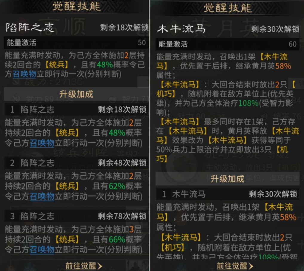 高顺发动天赋【统兵列阵】,为我方全体施加统兵(增加格挡率),进一步提高我方全体承伤能力,觉醒技能【陷阵之志】再为我方全体施加额外统兵层数,并有概率令己方召唤物立即行动一次,可以和黄月英觉醒技能【木牛流马】互相配合。