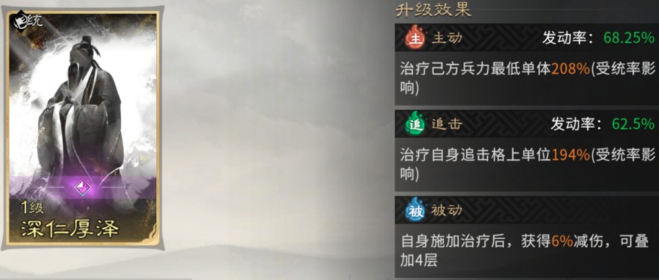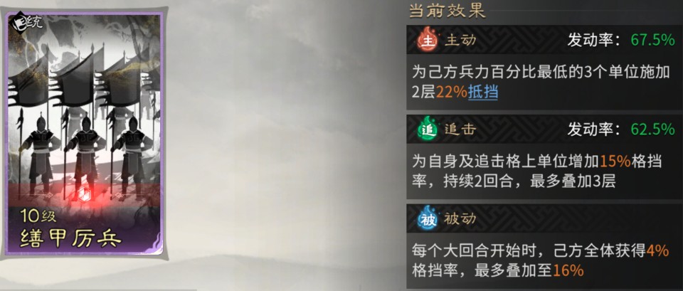 于禁:主动技能固定携带【深仁厚泽】,为我方兵力百分比最低单位回复兵力,提高我方续航能力。被动技能固定携带【缮甲厉兵】进一步提高我方全体的格挡率,提高我方承伤能力。