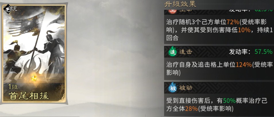 高顺:主动技能与追击技能都固定携带【深仁厚泽】,为我方兵力最低单位提供回复。被动技能固定携带【首尾相援】,受到伤害后为我方全体回复兵力。