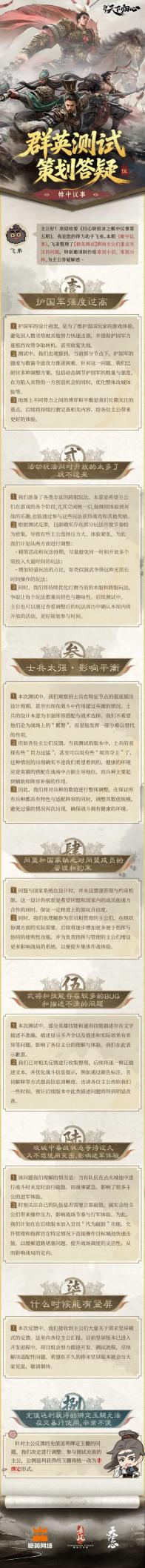 主公们好!自「群英测试」开启以来,承蒙各位主公热情参与,并为我们提供了诸多宝贵意见与建议。针对大家集中关注的问题,本期《帷中议事》特邀策划天一与策划小羽,为主公详解后续优化方向。具体详情,恭请主公查阅下方图文。