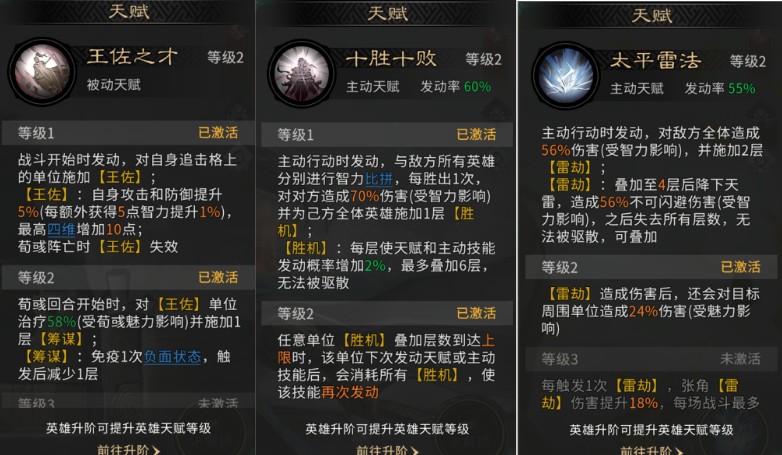 郭嘉发动天赋【十胜十败】,拼点胜利后为己方全体武将施加1层【胜机】效果,每层使天赋与主动技能发动概率提高2%,可叠加6层。叠满后消耗全部层数,使目标立即额外发动一次天赋或主动技能。