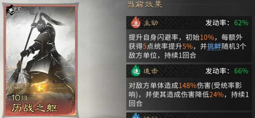 太史慈的天赋技能【挽弓贯阵】在造成伤害的同时,可以为自身和追击格上单位施加【避实】(每层使闪避率增加10%,持续2回合)