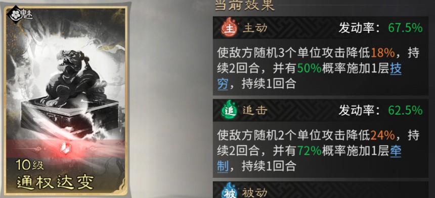 甄姬:主动技能固定携带【通权达变】,降低敌方攻击并有概率施加【技穷】(无法发动主动技能);被动技能固定携带【凌波微步】,增加自身和追击格上单位的闪避率。