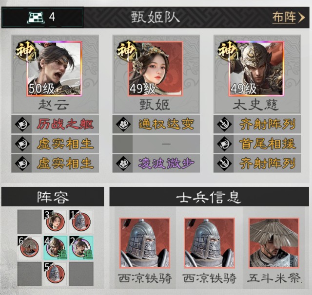 兵种站位:太史慈下方和甄姬前方各放置一名西凉铁骑,在太史慈的后方放置一名五斗米祭。
