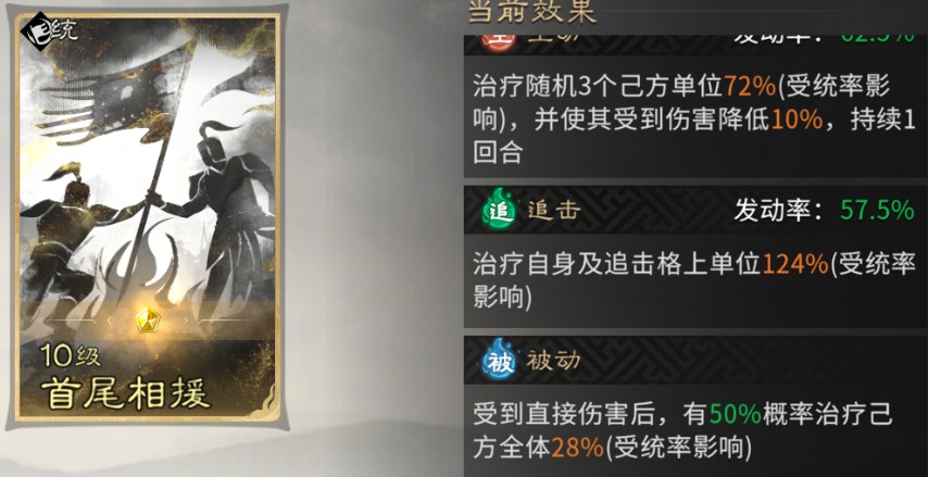 太史慈:主动技能和被动技能都固定携带【齐射阵列】,主动发动时对敌方全体造成伤害,被动效果可在造成直接伤害时,有概率降低目标防御;追击技能固定携带【首尾相援】,治疗自身和追击格上单位。