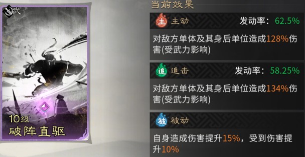 追击技能固定携带【破阵直驱】,由于前期敌方站位通常较密集,【破阵直驱】可穿透对方前排,直接攻击到中排核心输出。