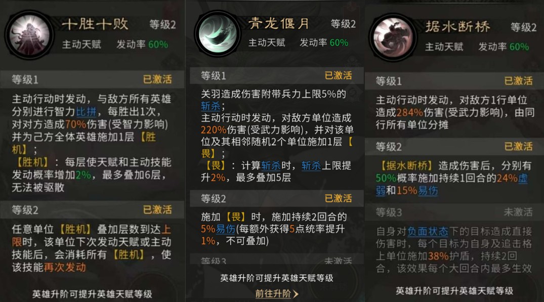 关羽的主动技能固定携带【万军取首】,该技能倍率优秀,对低兵力单位有增伤效果,且发动概率较高。配合关羽天赋【青龙偃月】赋予的【畏】(易伤)状态,可打出极为可观的爆发伤害。