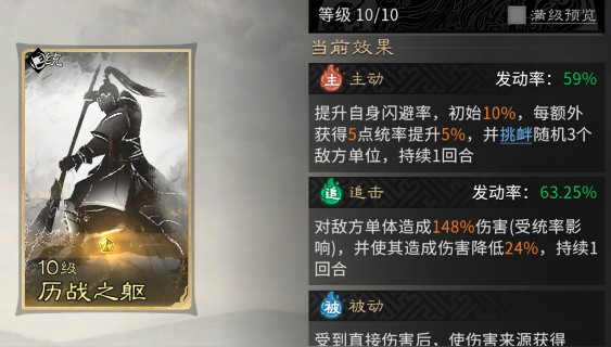 主动技能固定携带【历战之躯】,在提升自身闪避率的同时,可挑衅三名随机敌方单位。其施加的【挑衅】效果属于控制状态,可触发贾诩天赋【纵傀】,造成额外伤害。