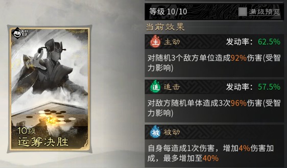 被动技能固定携带【运筹决胜】,该技能可提供高达40%的伤害加成上限。配合天赋【纵愧】的多次触发,能在战斗前期瞬间拉满被动层数。