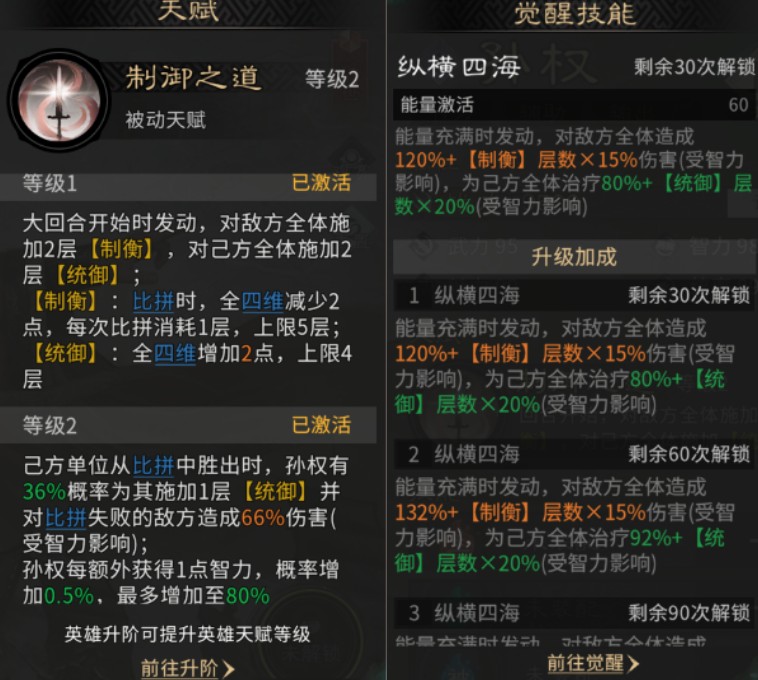 孙权的觉醒技能【纵横四海】,为全体AOE+全体体治疗。该技能数值是动态成长的。战斗回合越久,孙权通过天赋施加的【制衡】(敌方身上的Debuff)和【统御】(己方身上的Buff)层数越多,觉醒的伤害和恢复量就越高。这是一个典型的长线作战收割技,层数叠满后爆发极高。